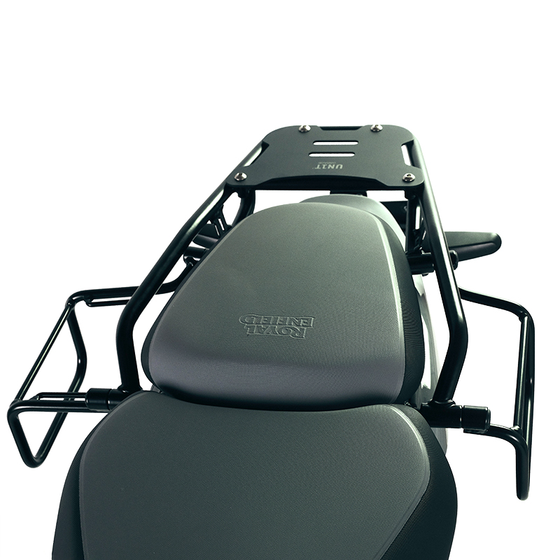 Diseñada sobre el bastidor Royal Enfield, se integra perfectamente con el resto de la motocicleta y está fabricada en acero tratado con acabado en polvo epoxi negro mate