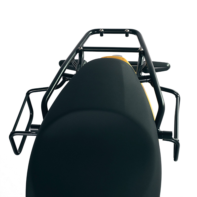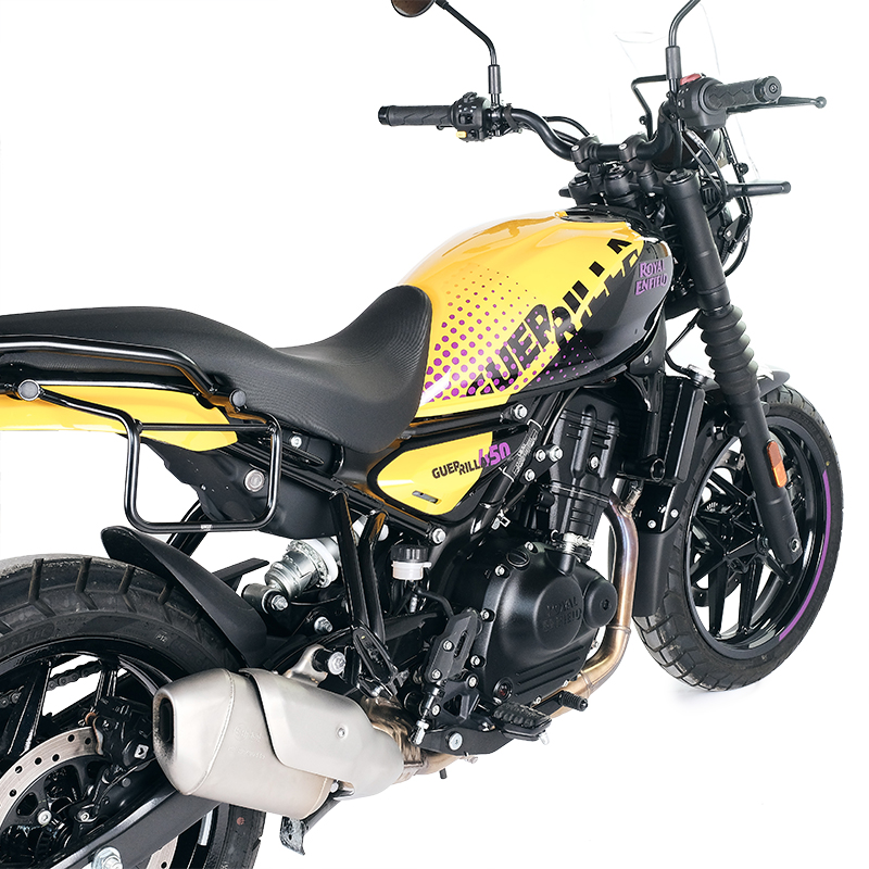 Diseñado sobre el bastidor Royal Enfield, se integra perfectamente con el resto de la motocicleta y está fabricado en acero tratado con acabado en polvo epoxi negro mate