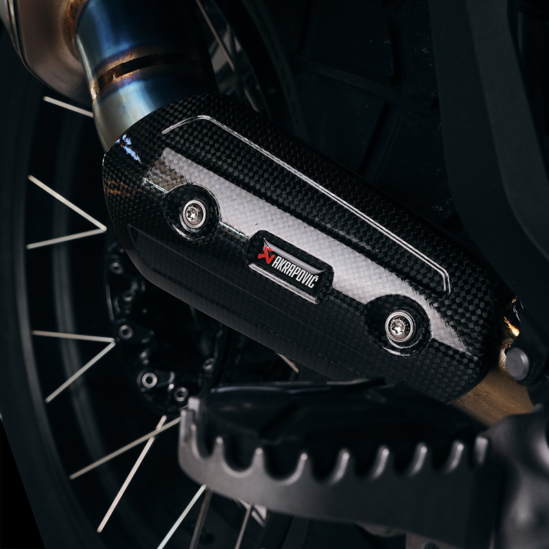 Colector Akrapovic fabricado en titanio de alta calidad con protección de fibra de carbono.