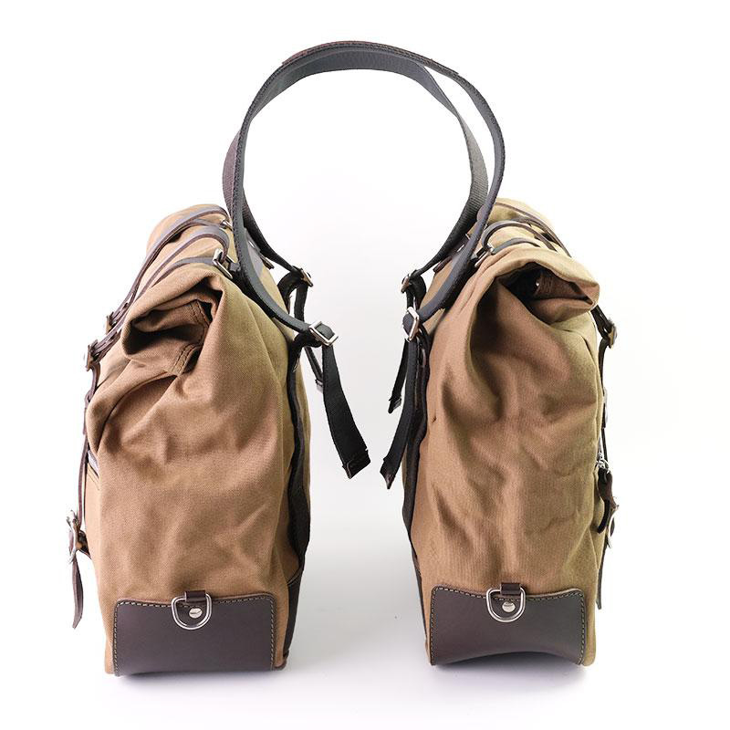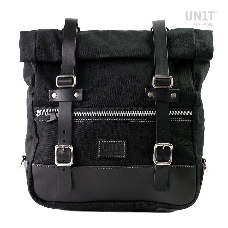 Simple y puro como los materiales con los que fueron construidos. Par de bolsos hechos a mano en Italia en resistente algodón impermeable de alta calidad. Atención al detalle con acabados de cuero de 3 mm. Universal es adaptable a todas las motocicletas, simplemente moviendo el ajuste de las bandas centrales cambia la altura desde el suelo. La parte posterior de la bolsa está equipada con ganchos de tela para fijar en la bicicleta. En la parte delantera, un gran bolsillo con cremallera para teléfono y documentos. Una vez fuera de la bicicleta, puede usar las bandas centrales sobre el hombro o sobre el hombro.