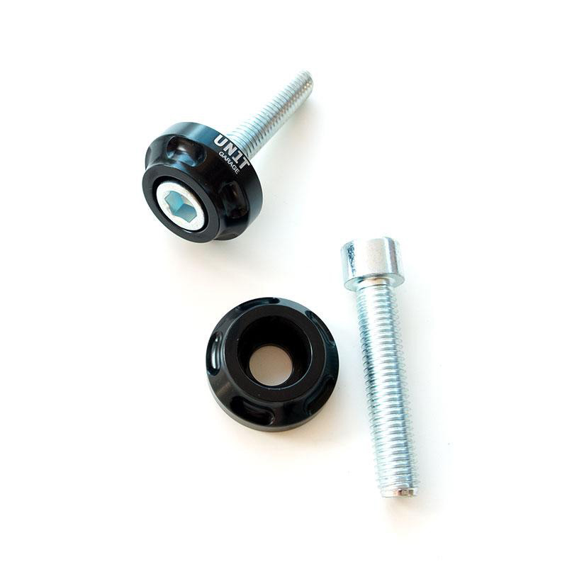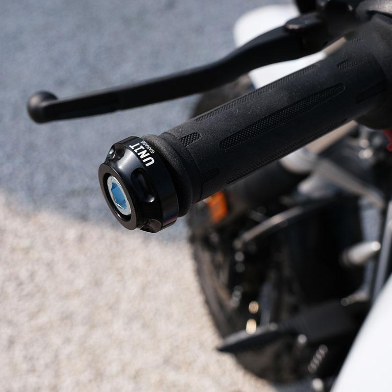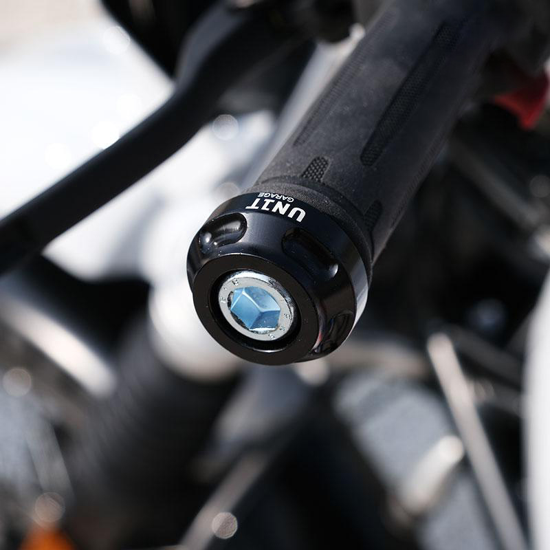 Par de extremos de manillar CNC con acabado negro brillante y logotipo de la unidad de garaje. Se incluyen los dos tornillos M12 de fijación.