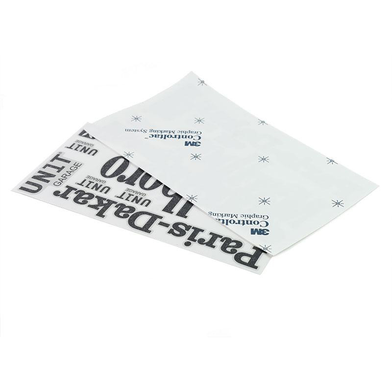 Par de adhesivos protegidos con film especial resistente a los rayos UV; siendo pre-espaciados, también son aplicables en parte, por ejemplo, solo la escritura o solo el logotipo