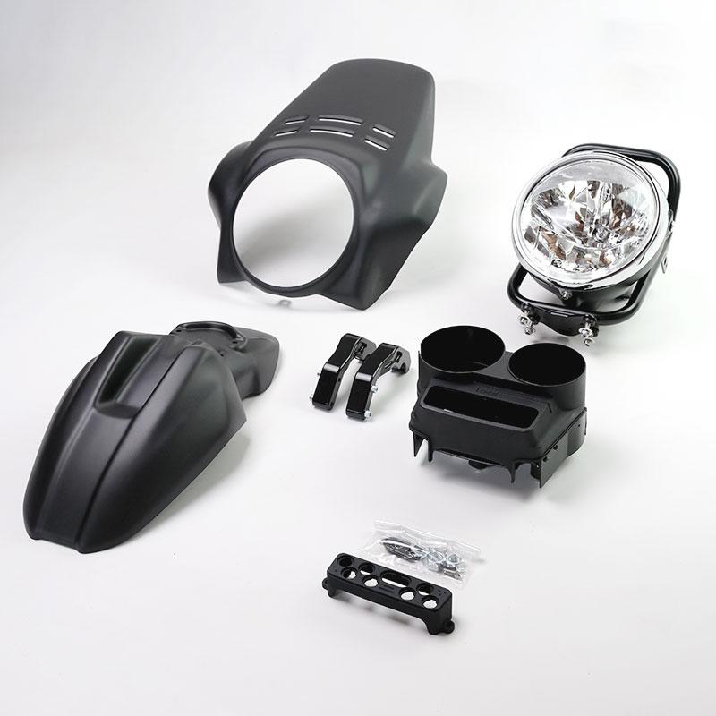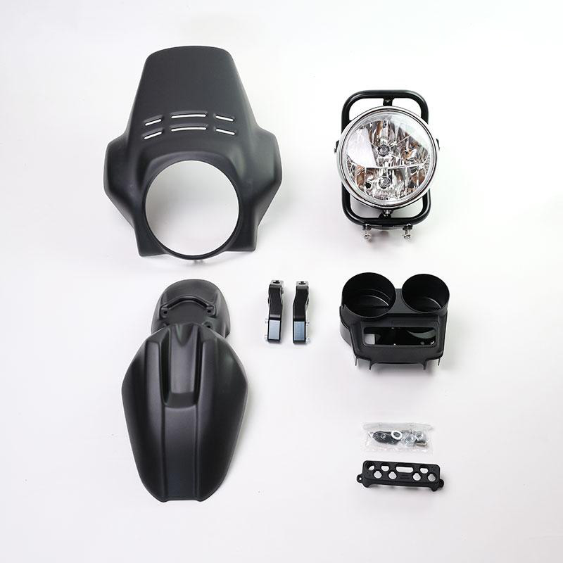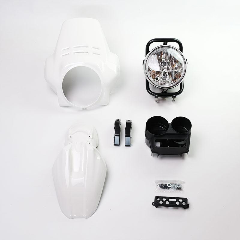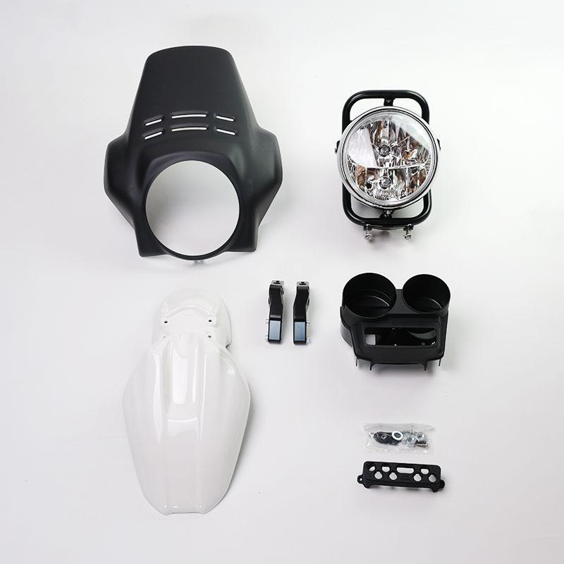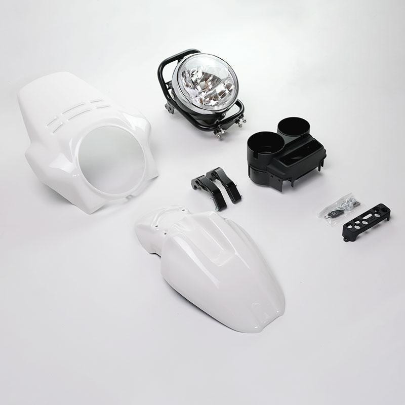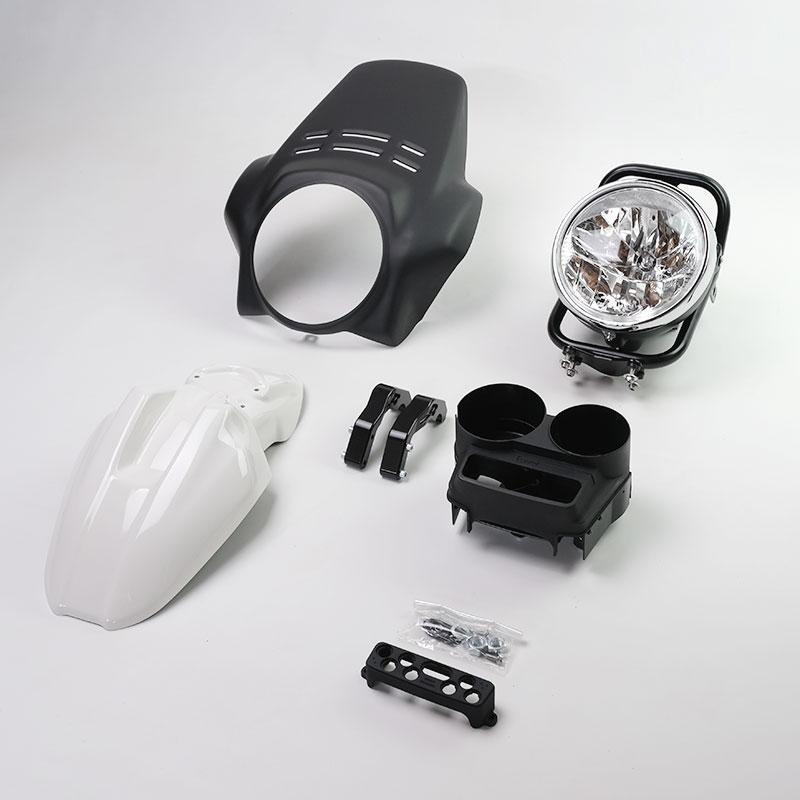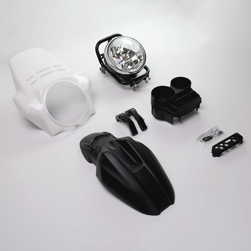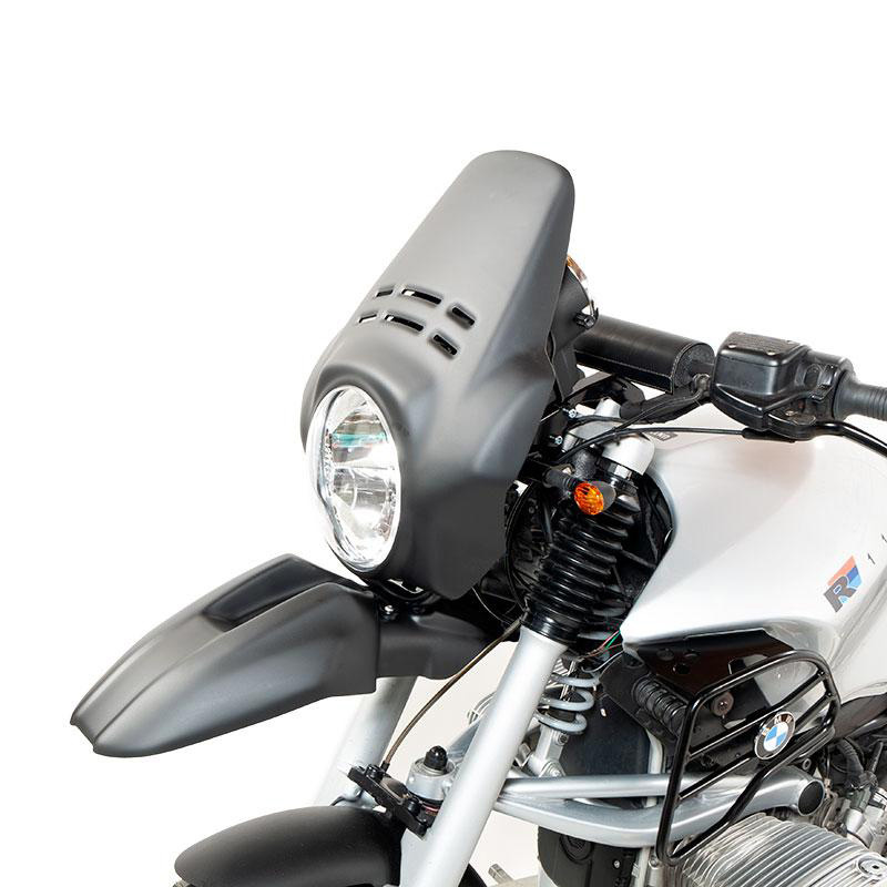El kit ofrece el guardabarros delantero en dos colores. Recuerda las líneas de la punta GS de los años 80, con acabado Alpinewhite o Matt Black o Red; se puede montar simplemente fijándolo en los accesorios correspondientes del marco del faro Cod. 1216.