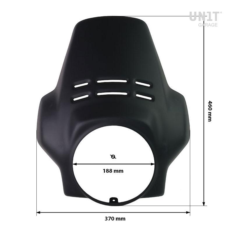 Fabricado en acero tratado con pinturas en polvo de alta resistencia. Se monta fácilmente sobre Riser Cod. 1555 y permite el alojamiento del faro, el guardabarros alto, los intermitentes originales y las pantallas opcionales. Está preparado para la instalación del salpicadero con tacógrafo y tacómetro originales. - FARO DELANTERO