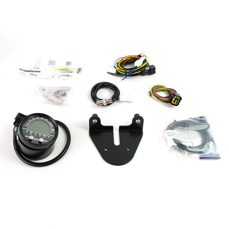Computadora con cuerpo y aro negro Medidas: diámetro 73 mm - altura 41 mm. Tacómetro e indicador de velocidad de hasta 300 km / h; odómetros parciales y totales, tiempo, velocidad máxima, tiempo de viaje parcial y total; Pantalla LCD con dos líneas digitales y un gráfico de barras analógico para el cuentarrevoluciones; Pantalla LCD con fondo LED azul; Memorización de kilometraje y distancia total; Visualización de la hora incluso cuando el aparato está apagado; Ajuste de la circunferencia de la rueda adaptable a todos los tipos de rueda (1-3999 mm de ancho); Unidad de medida de velocidad en millas o kilómetros; Carcasa impermeable; Indicadores de dirección, luces, presión de aceite, indicador neutral y anomalías del motor; Medidor gráfico de combustible. Incluido en el paquete encontrará Sensor de velocidad con imán; Kit de montaje y soporte todo en aluminio inoxidable; Cableado con conexiones de estaño impermeables; Instrucciones de montaje y manual.