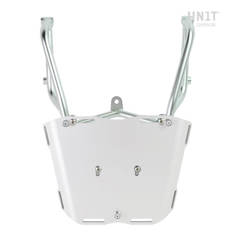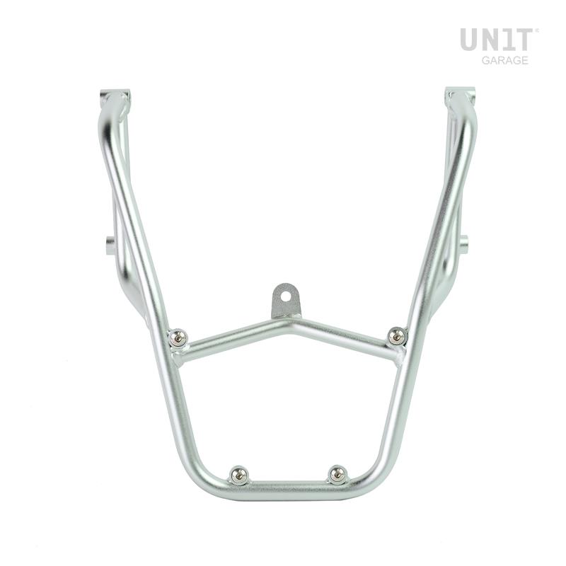 Portaequipajes fabricado en tubo de acero con acabado en polvo epoxi negro mate. Completa la parte trasera y está equipada con asas para el pasajero, se fija de forma muy sencilla a la moto original con los tornillos suministrados. Robusto y práctico, está equipado con 4 casquillos en la superficie de apoyo para la fijación de la placa código: AL5.