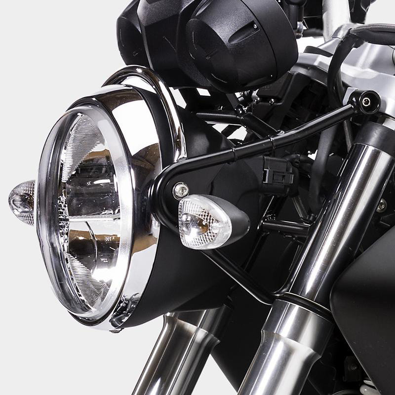 Hecho de acero tratado con pinturas en polvo de alta resistencia. Se adapta fácilmente a los agujeros provistos en la placa de horquilla y permite la carcasa del faro y el tablero original. Para ensamblar el tablero con tacógrafo y tacómetro, es necesario desmontar e insertar en los agujeros especiales los 3 gomas en el marco de plástico original. NB . se puede montar en los modelos BMW R1200 R de 2006 a 2010.