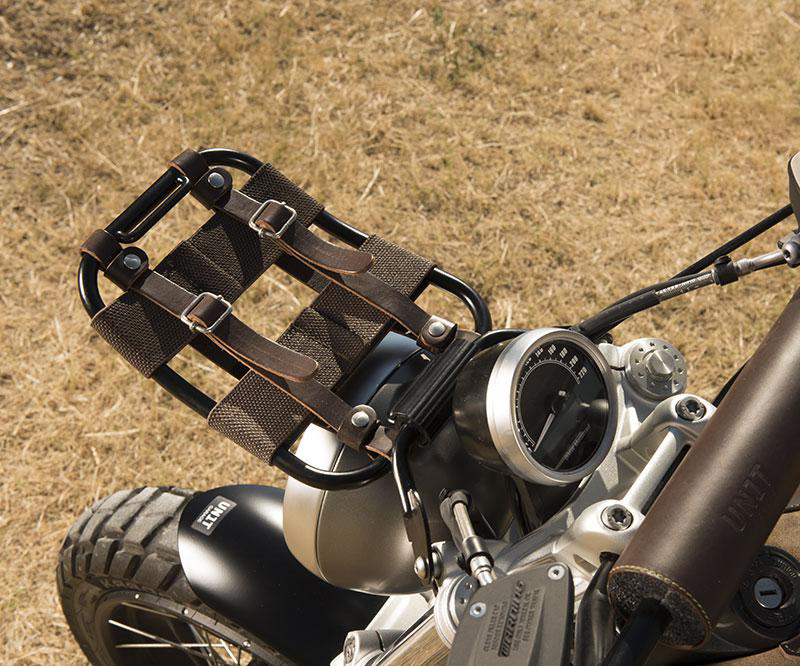 Hecho de tubo de acero con acabado en polvo epoxi negro y accesorios de cuero marrón. Este elegante accesorio amplía la gama de nuestros productos ya disponibles para los modelos 9T Scrambler y Pure.