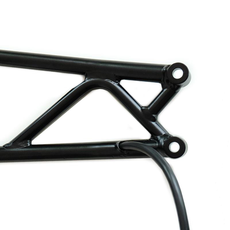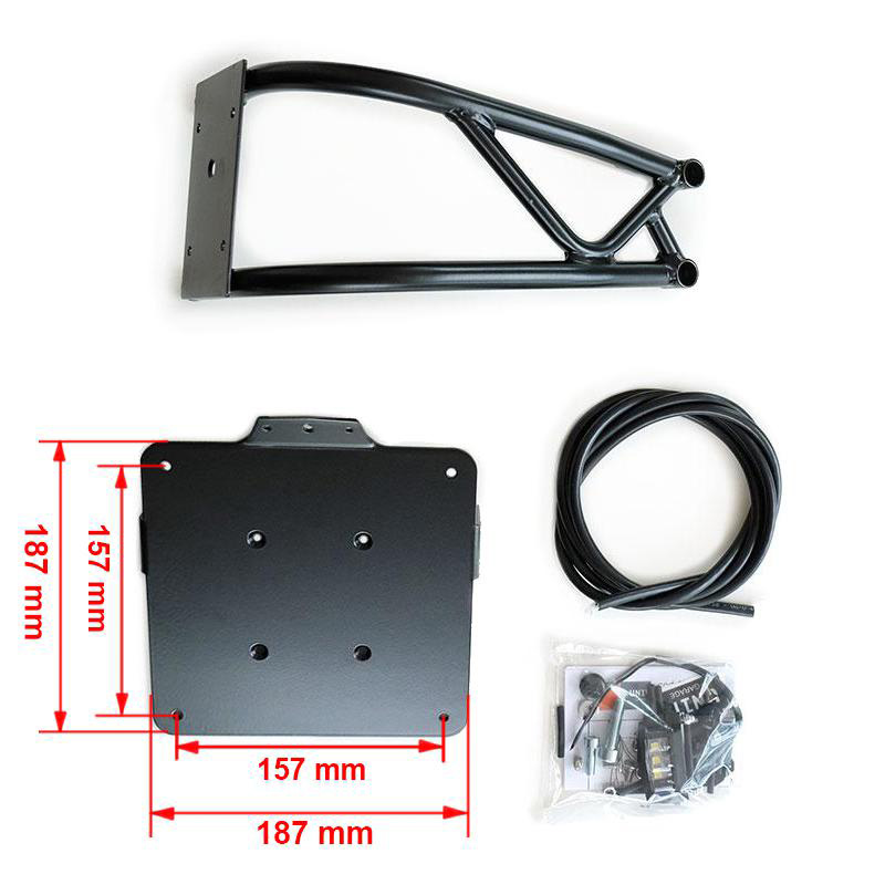 Fabricado en tubo de acero con acabado en polvo epoxi negro mate completo de portamatrículas de aluminio con soportes para flechas originales o aftermarket (flechas no incluidas). Se suministra con luz de matrícula led. Se incluye la extensión del mazo de cables para el faro y los intermitentes, el cable pasa por el interior del tubo. Dimensiones porta matricula: 187 x 187 mm