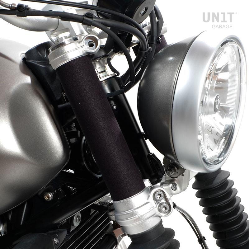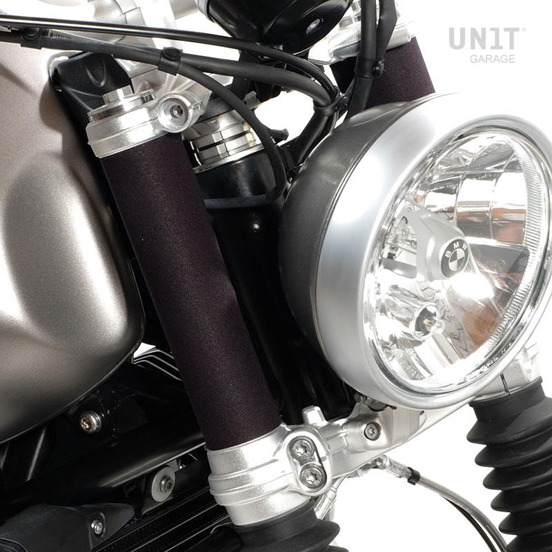 Estas 2 protecciones en neopreno con cierre de velcro permiten proteger los deslizadores de la horquilla y terminar la parte entre las placas. Se montan en unos minutos sin desmontar la horquilla. ¡El resultado es fantástico!