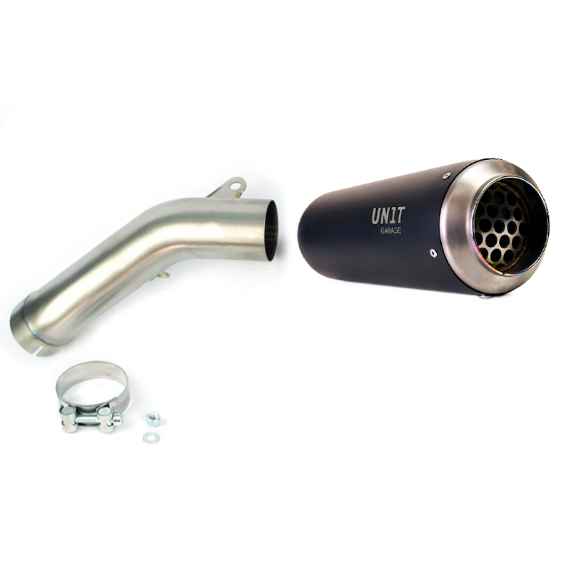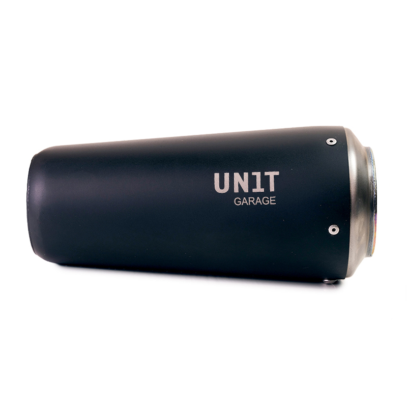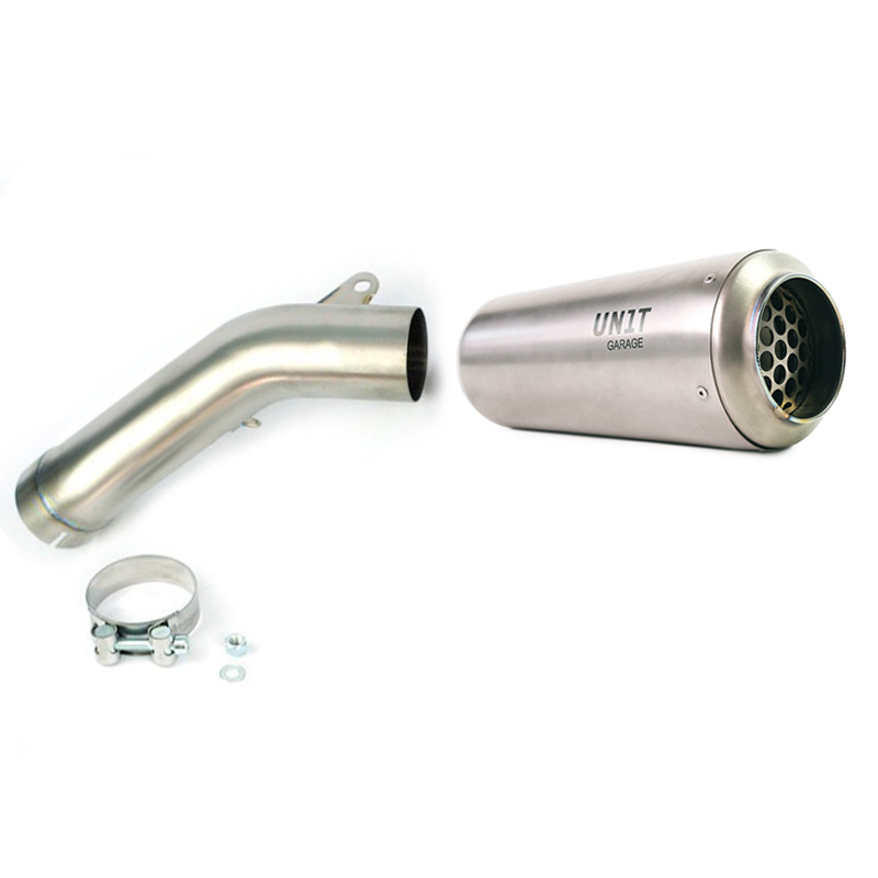 Silenciador de titanio y racores de acero inoxidable trabajados totalmente a mano, en perfecto estilo moto gp.