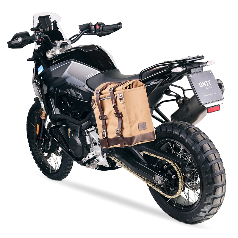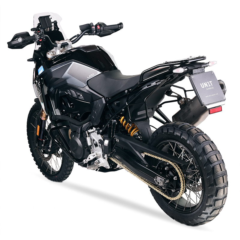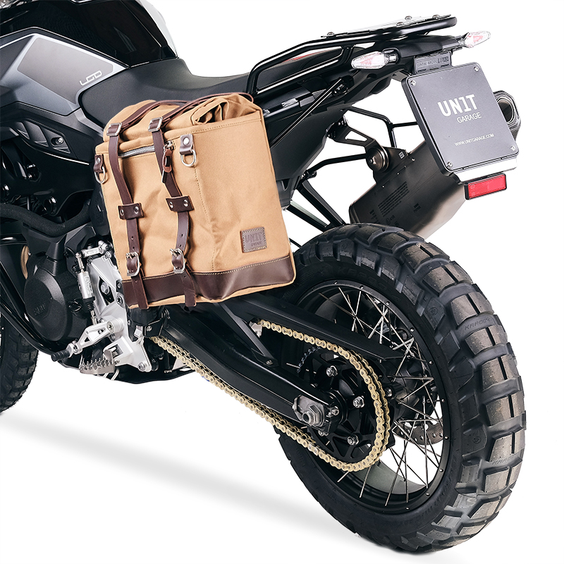 Diseñado sobre el cuadro de la BMW F900GS, se integra perfectamente con el resto de la moto. Preparado para alojar nuestro sistema de fijación rápida, bonito y minimalista incluso cuando el bolso no está montado. Se puede utilizar cómodamente con un pasajero a bordo y es compatible con nuestro portaequipajes.