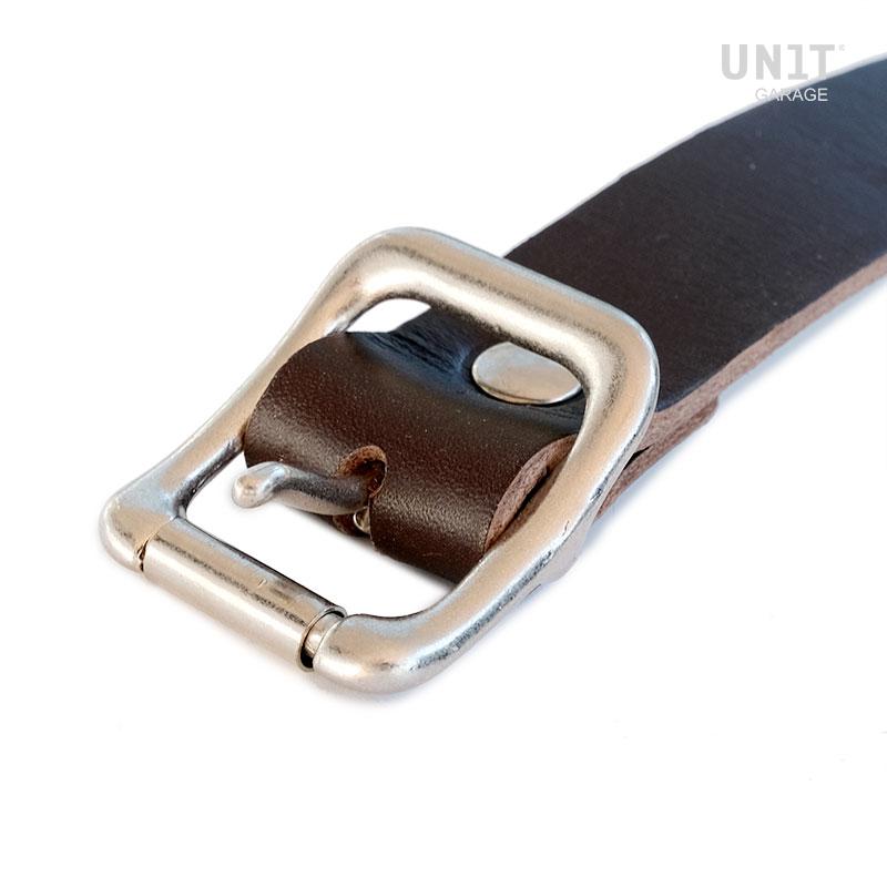 Banda de cuero para portaequipajes, disponible en dos colores que combinan con todos nuestros productos de cuero negro o marrón.