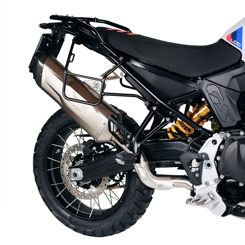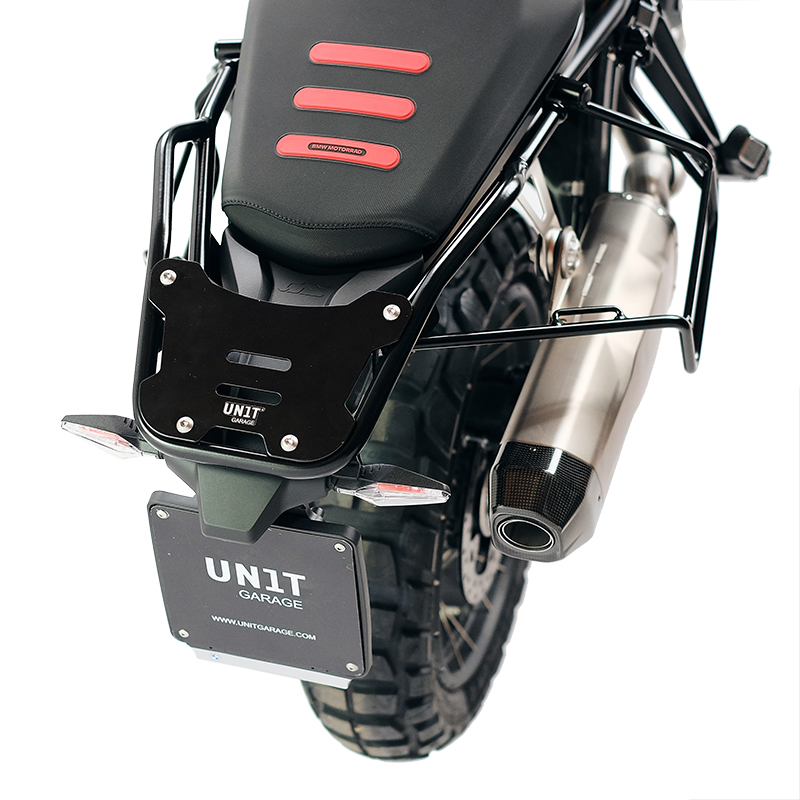 Diseñado sobre el cuadro de la BMW F900GS, se integra perfectamente con el resto de la moto. Preparado para alojar nuestro sistema de fijación rápida, bonito y minimalista incluso cuando el bolso no está montado. Se puede utilizar cómodamente con un pasajero a bordo y es compatible con nuestro portaequipajes.