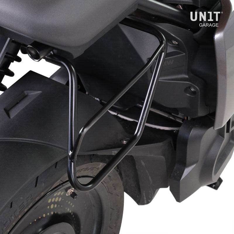 Diseñado sobre el cuadro BMW CE 04, se integra perfectamente con el resto de la moto. Listo para albergar nuestro sistema de fijación rápido, hermoso y mínimo, incluso cuando la bolsa no está montada. Se puede utilizar cómodamente con el pasajero a bordo.
