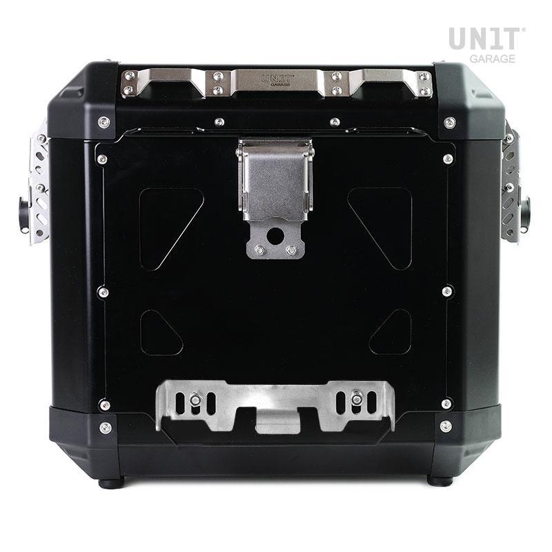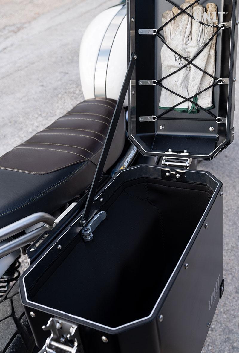 Bolsa lateral de aluminio de 40L Queríamos bolsos elegantes, clásicos y resistentes, con hermosas bisagras de acero y cuidados detalles: detalles creados para la aventura y resistentes a todas las condiciones. Se pueden fijar a cualquier estructura de tubo redondo gracias al sistema de enganche de seguridad colocado en la parte trasera de la bolsa, el cierre se ensancha automáticamente para facilitar el montaje y desmontaje de la estructura de la bolsa, la palanca interna está mecanizada con CNC en aleación de aluminio de alta calidad. .