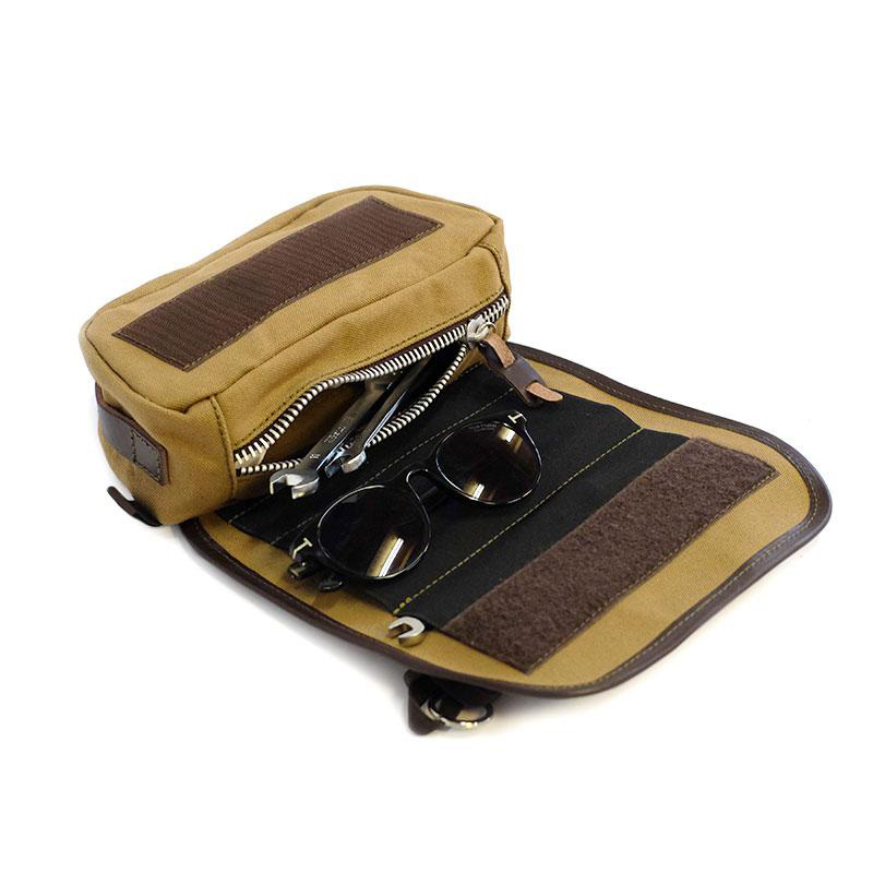 En perfecto estilo vintage, nació como una bolsa de manillar clásica, pero luego nos dimos cuenta de que se puede usar de muchas maneras, tanto fijada a la bicicleta como llevada como una bolsa usando los bucles en la parte trasera una vez que llegas a tu destino. . Con atención a los detalles más pequeños con acabados de cuero de 3 mm, está equipado con trabillas en la parte delantera, en la parte trasera y en los laterales. En el interior, además de la zona cerrada con cremallera, hemos dispuesto un gran elástico dividido en 4 tramos de diferentes tamaños, que permite la rápida inserción de gafas, bolígrafos, smartphones o pequeñas herramientas. Externamente, en la solapa frontal, encontrarás una banda de cuero fijada con velcro, provista de un llavero. Nuestro soporte para teléfono cód. 1607 se puede fijar en el velcro.