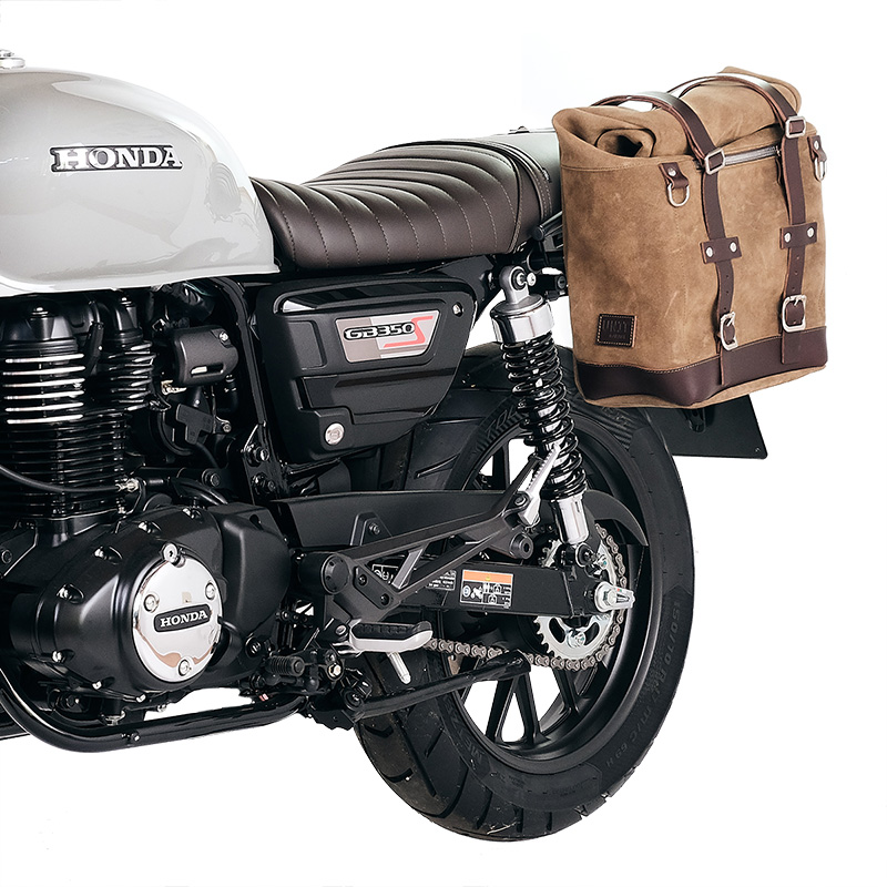 Diseñado sobre el cuadro Honda GB350S se integra perfectamente con el resto de la moto. Preparado para alojar nuestro sistema de fijación rápida, bonito y minimalista incluso cuando el bolso no está montado. Se puede utilizar cómodamente con un pasajero a bordo.