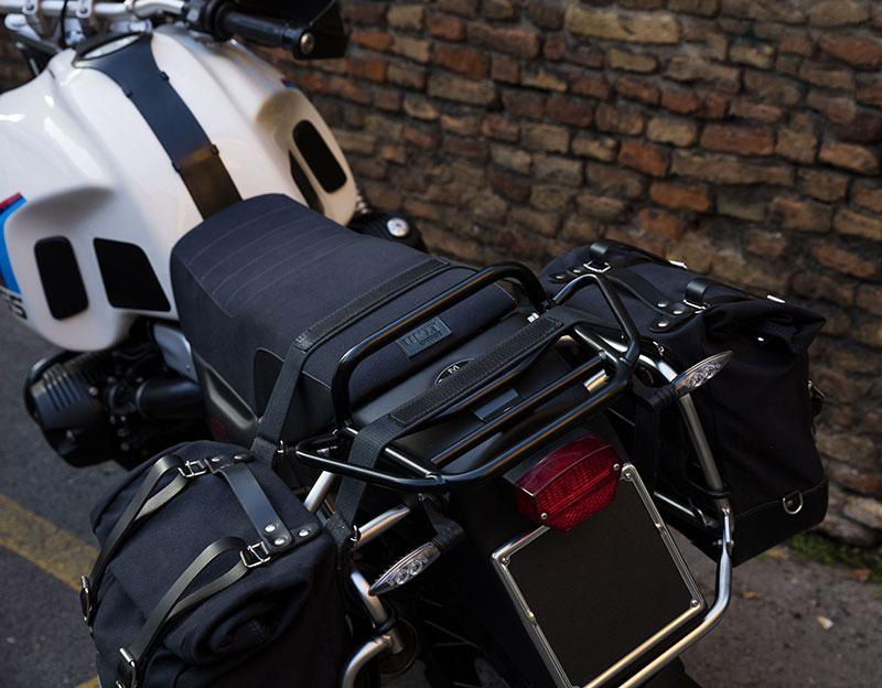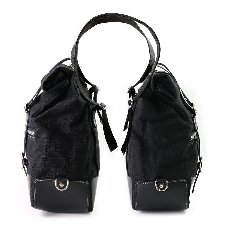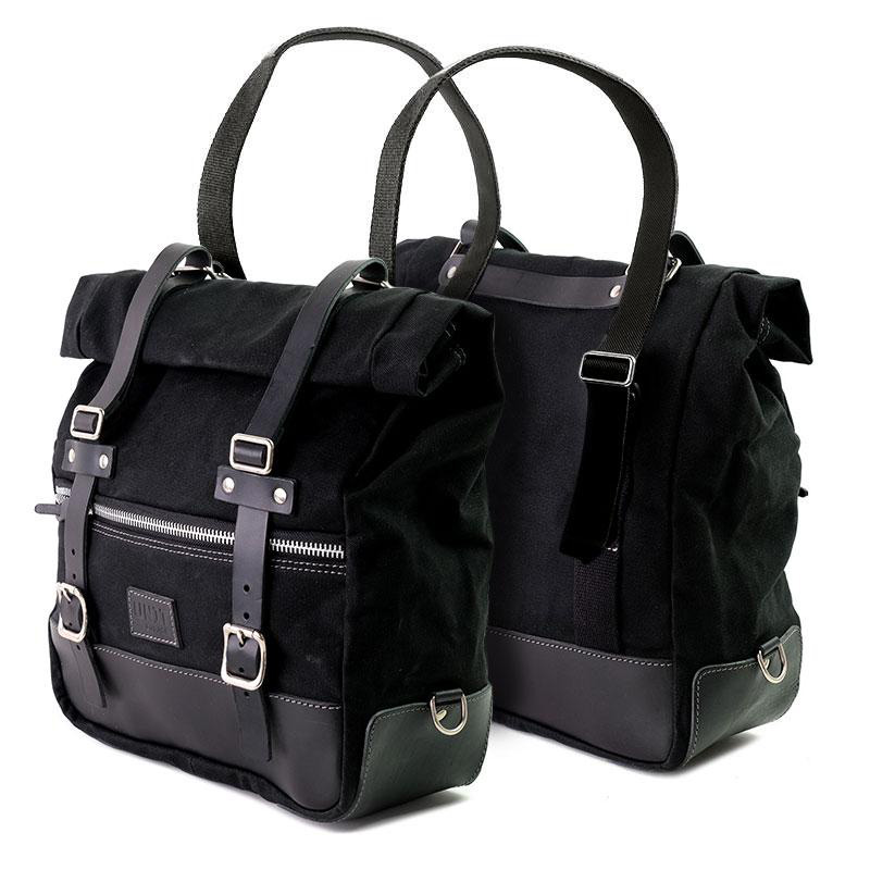 Simple y puro como los materiales con los que fueron construidos. Par de bolsos hechos a mano en Italia en resistente algodón impermeable de alta calidad. Atención al detalle con acabados de cuero de 3 mm. Universal es adaptable a todas las motocicletas, simplemente moviendo el ajuste de las bandas centrales cambia la altura desde el suelo. La parte posterior de la bolsa está equipada con ganchos de tela para fijar en la bicicleta. En la parte delantera, un gran bolsillo con cremallera para teléfono y documentos. Una vez fuera de la bicicleta, puede usar las bandas centrales sobre el hombro o sobre el hombro.