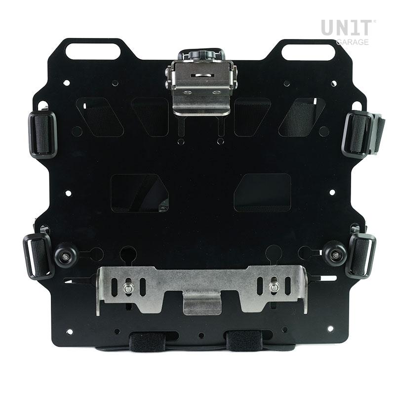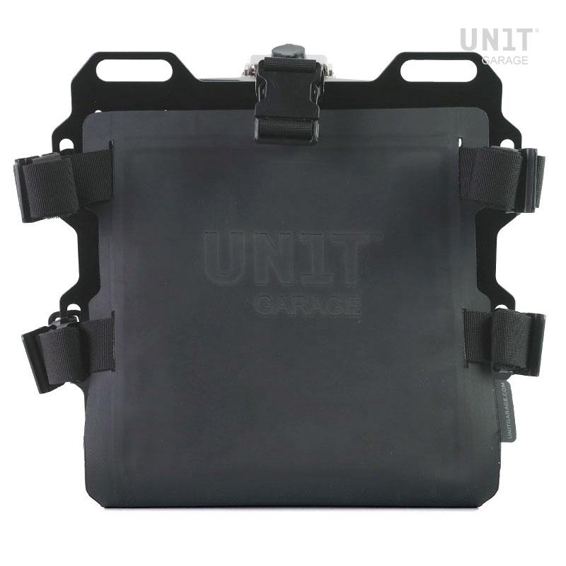 La solapa frontal, con atención a los detalles más pequeños, con acabados Hypalon, se puede ajustar mediante los cursores suministrados y se puede quitar muy rápidamente de la placa, perfecta si se combina con el código de bolsa UG006
