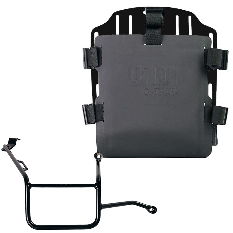 placa, que está provista de un bloqueo para bloquear en el propio marco. La placa crea una superficie de montaje plana en el costado de la bicicleta, esto permitirá el transporte de bolsas sueltas u otros objetos, como sacos de dormir, chaquetas, etc. La solapa frontal, con atención a los detalles más pequeños, con acabados en Hypalon, se puede ajustar mediante los deslizadores suministrados y se puede quitar muy rápidamente de la placa.