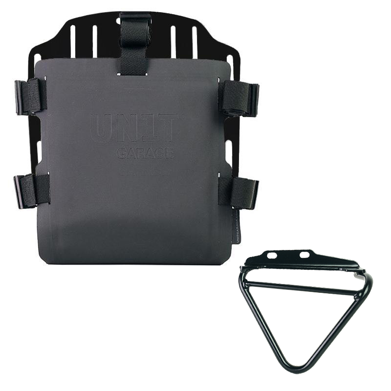 Placa, equipada con un candado para fijarla al chasis. Esta placa crea una superficie de montaje plana en el lateral de la motocicleta, lo que permite transportar bolsas sin accesorios ni otros objetos, como sacos de dormir, chaquetas, etc. La solapa frontal, cuidadosamente detallada y con ribete de Hypalon, se ajusta mediante los deslizadores incluidos y se retira rápidamente de la placa.
