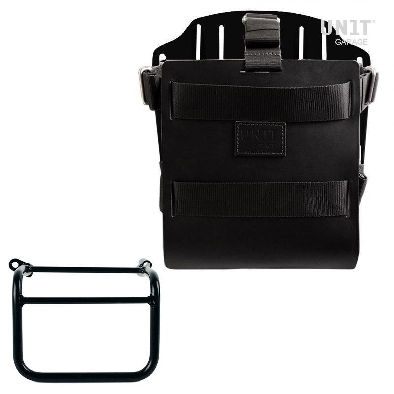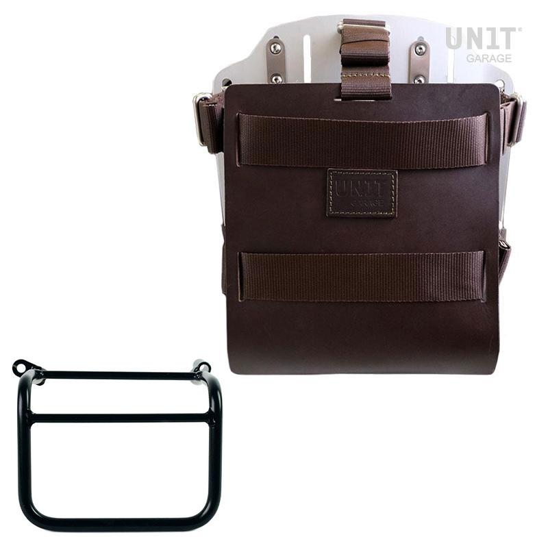 Placa portabolsas de aluminio anodizado con frontal de cuero ajustable. Se fija rápidamente a nuestros marcos portabolsas con el sistema de liberación rápida código U000 ya incluido y montado en la parte posterior de la placa, que está equipada con un bloqueo para bloquear en el propio marco. La placa crea una superficie de montaje plana en el lateral de la motocicleta, esto permitirá el transporte de bolsas sin accesorios u otros objetos, como sacos de dormir, chaquetas, etc. La solapa frontal, cuidada hasta el más mínimo detalle con acabados en piel de 3 mm, se puede ajustar mediante los cursores suministrados y se puede retirar muy rápidamente de la placa.