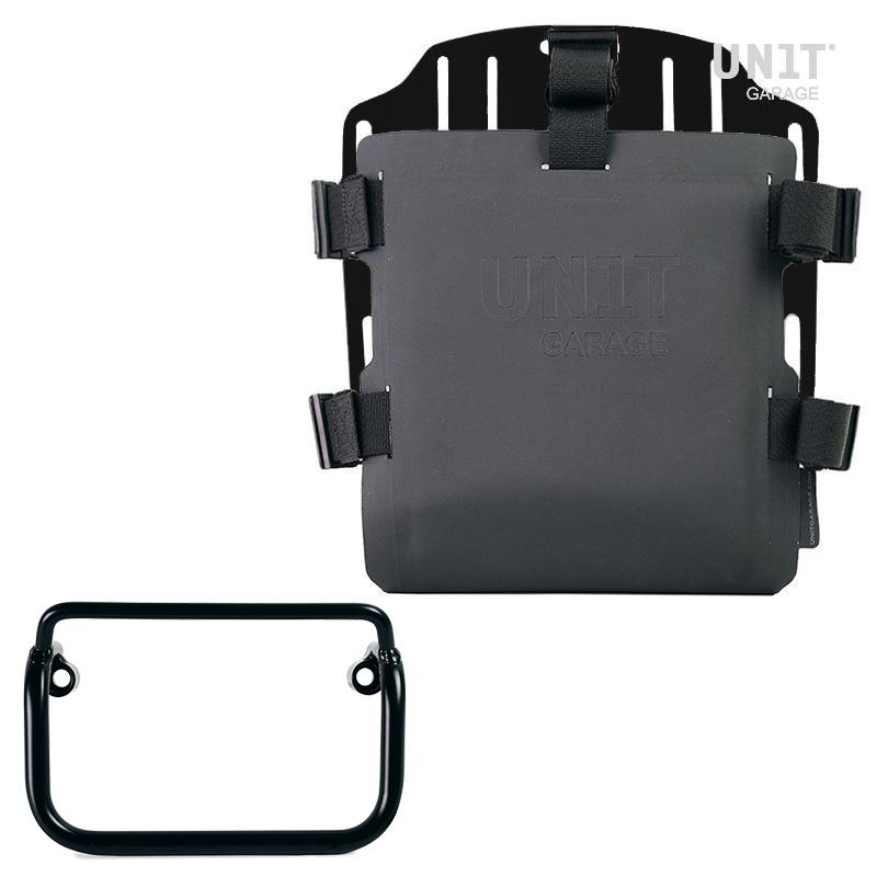 placa, que está provista de una cerradura para bloquear en el propio marco. La placa crea una superficie de montaje plana en el costado de la bicicleta, esto permitirá el transporte de bolsas sueltas u otros objetos, como sacos de dormir, chaquetas, etc. La solapa frontal, con atención a los detalles más pequeños, con acabados en Hypalon, se puede ajustar mediante los cursores suministrados y se puede quitar muy rápidamente de la placa.