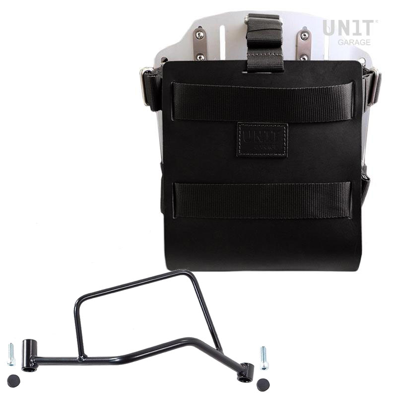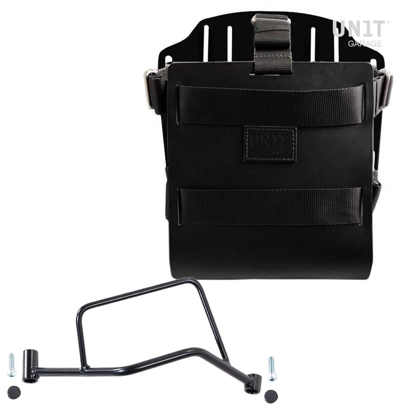 el sistema de liberación rápida código U000 ya incluido y montado en la parte posterior de la placa, que está equipada con un candado para bloquear en el marco mismo. La placa crea una superficie de montaje plana en el lateral de la bicicleta, esto permitirá el transporte de bolsas sueltas u otros objetos, como sacos de dormir, chaquetas, etc. La solapa frontal, con atención a los detalles más pequeños con acabados de cuero de 3 mm, se puede ajustar con los deslizadores suministrados y se puede quitar muy rápidamente de la placa.