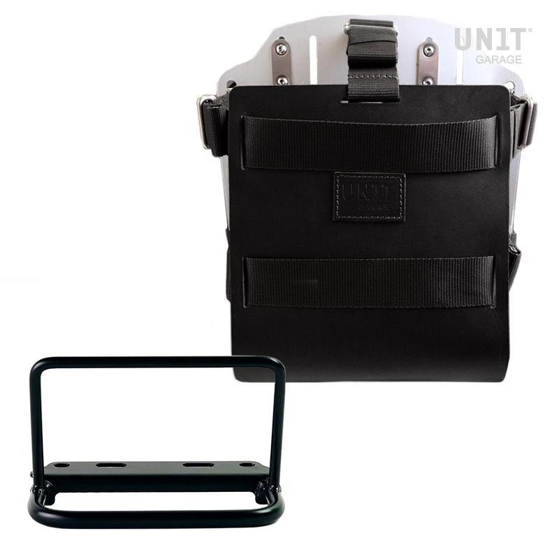 el sistema de liberación rápida cod.U000 ya incluido y montado en la parte trasera de la placa, que está dotada de cerradura para su bloqueo en el propio cuadro. La placa crea una superficie de montaje plana en el costado de la bicicleta, esto permitirá el transporte de bolsas sueltas u otros artículos como sacos de dormir, chaquetas, etc. La solapa frontal, realizada cuidando los más mínimos detalles y acabada en piel de 3 mm, se puede ajustar mediante los deslizadores suministrados y se puede quitar muy rápidamente de la placa.