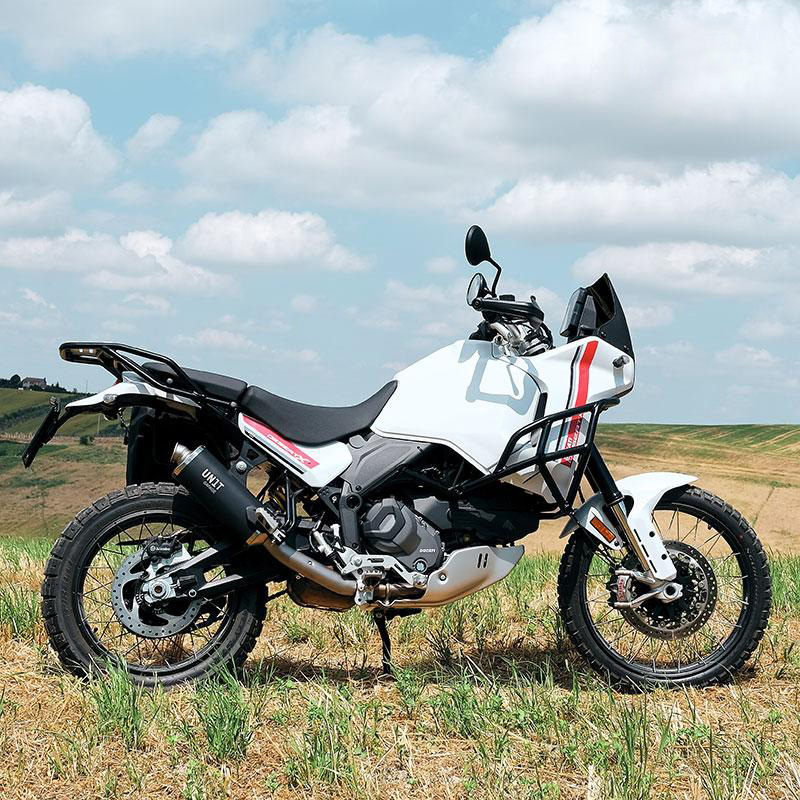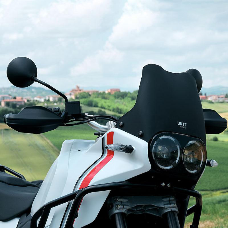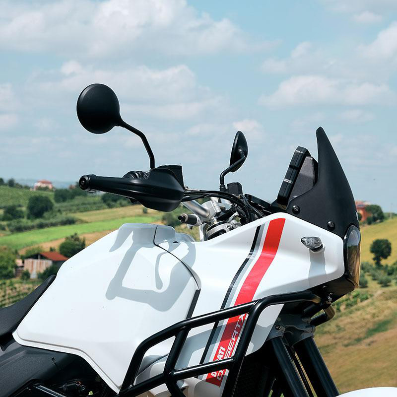 Carenado DesertX Edi Race diseñado para ser montado sin ninguna modificación reutilizando los soportes originales. La ergonomía del carenado es absolutamente personal y lo hemos desarrollado en diferentes formas, tamaños y transparencias, cada uno adecuado para diferentes alturas y expectativas. Fabricada en PMMA de 4 mm de espesor, en color negro mate, es la versión más pequeña: ¡la DesertX se vuelve muy racing y agresiva! Se suministra completo con tornillos e insertos de fijación en ergal anodizado negro, las gomas originales deben ser reutilizadas.