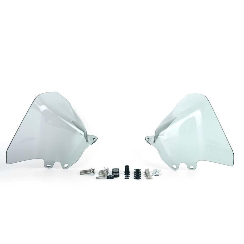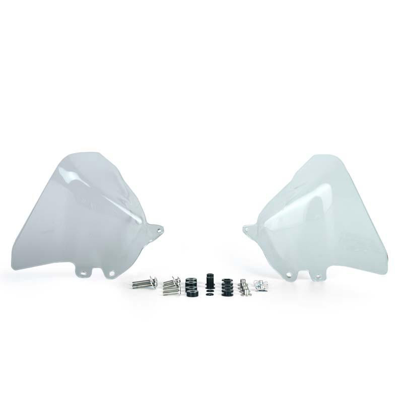 Par de deflectores laterales, Modelo pequeño (dimensiones más pequeñas que los originales). Se pueden montar rápidamente sin ninguna modificación, todo lo necesario se suministra en el kit de montaje. No alteran el diseño de la moto pero son realmente muy eficaces ofreciendo una gran protección adicional