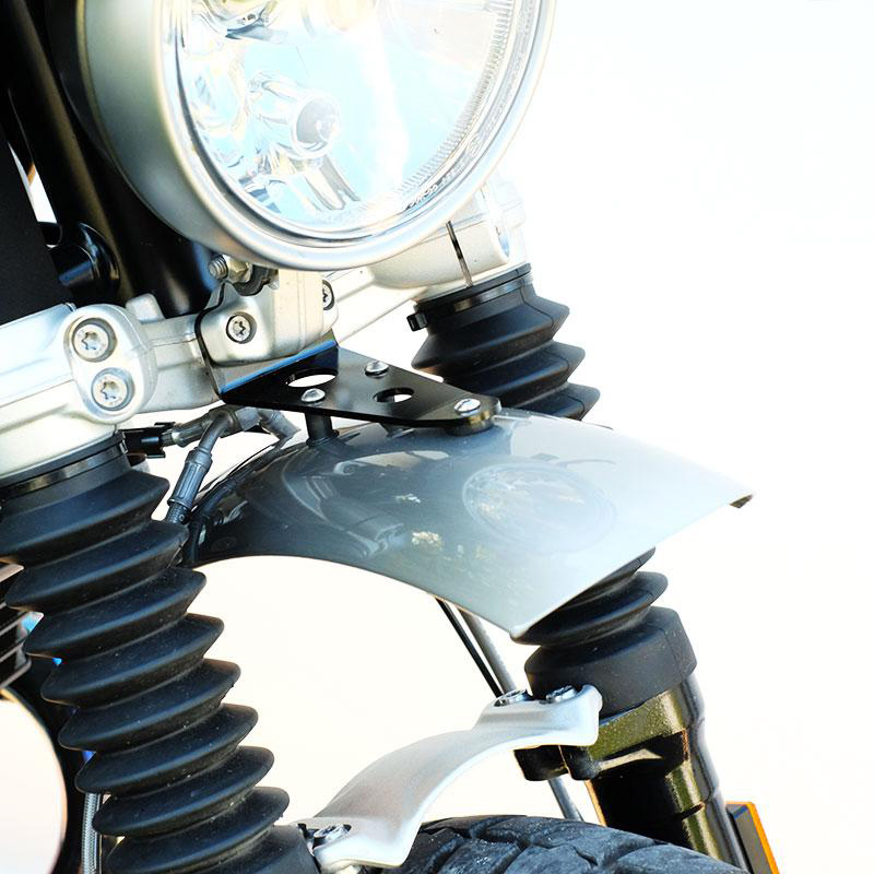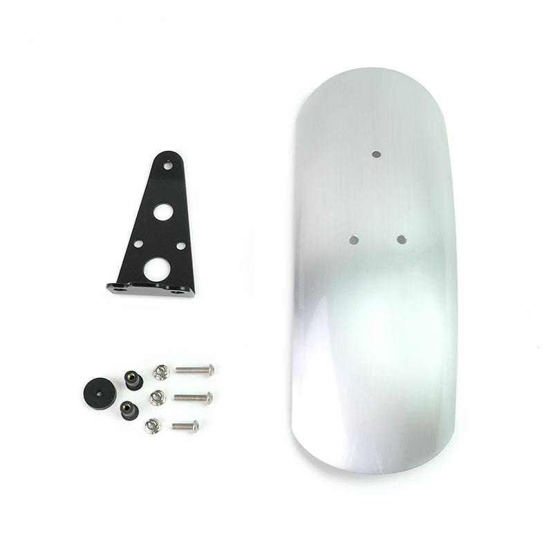 Reemplaza todo el guardabarros delantero original, en perfecto estilo "old school". Está equipado con un soporte de acero para fijación al soporte del faro, con acabado en polvo epoxi negro mate. Completo con guardabarros delantero de aluminio satinado con pintura transparente.