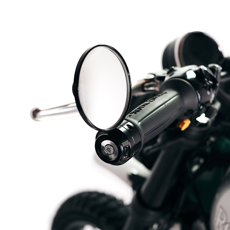 Espejos de aluminio anodizado negro fabricados a medida para Royal Enfield.