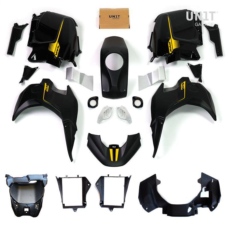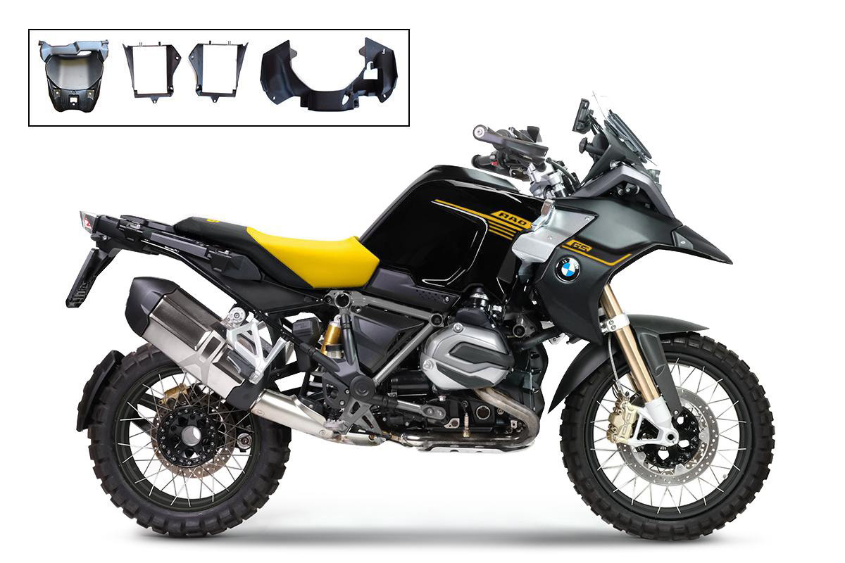 Rediseña toda la parte delantera de la bicicleta haciéndola más estrecha y cónica. En los laterales se encuentra la carcasa del logo original de la R1200 GS que se puede quitar de tu moto. Se proporcionan dos pegatinas troqueladas para sustituir las de los logotipos que vayas a desmontar.