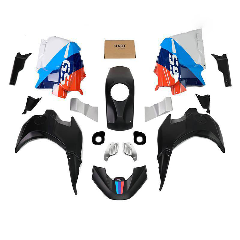 Rediseña toda la parte delantera de la bicicleta haciéndola más estrecha y cónica. En los laterales se encuentra la carcasa del logo original de la R1200 GS que se puede quitar de tu moto. Se proporcionan dos pegatinas troqueladas para sustituir las de los logotipos que vayas a desmontar.