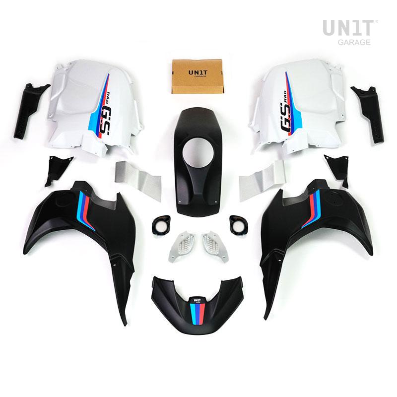 Rediseña toda la parte delantera de la bicicleta haciéndola más estrecha y cónica. En los laterales se encuentra la carcasa del logo original de la R1200 GS que se puede quitar de tu moto. Se proporcionan dos pegatinas troqueladas para sustituir las de los logotipos que vayas a desmontar.