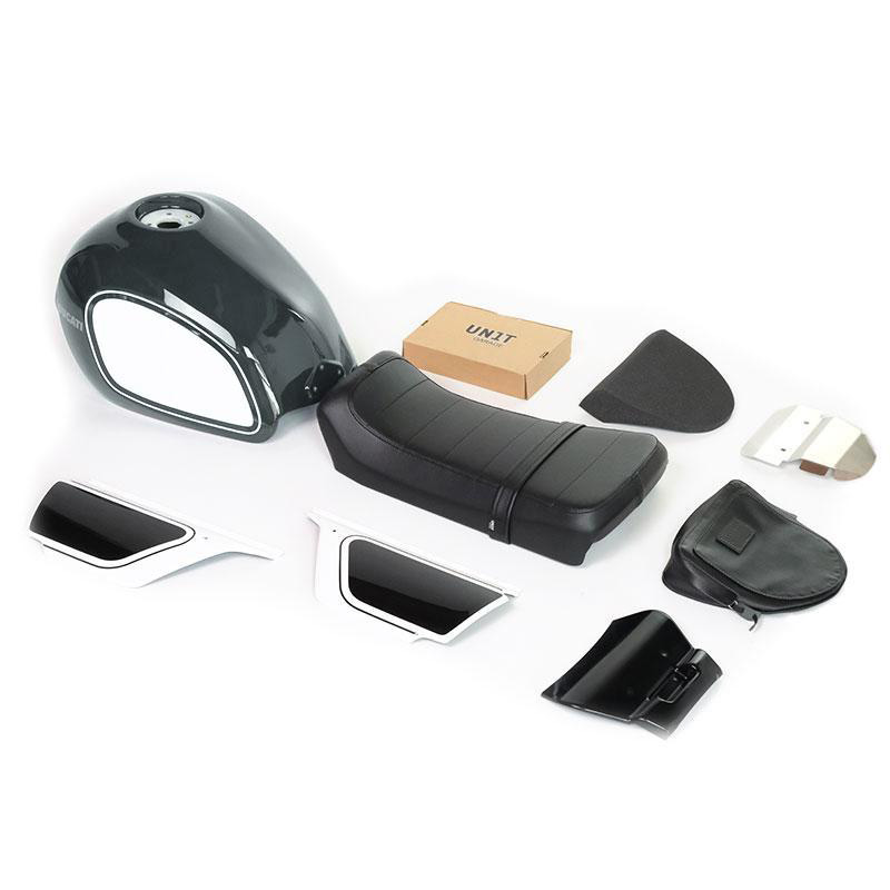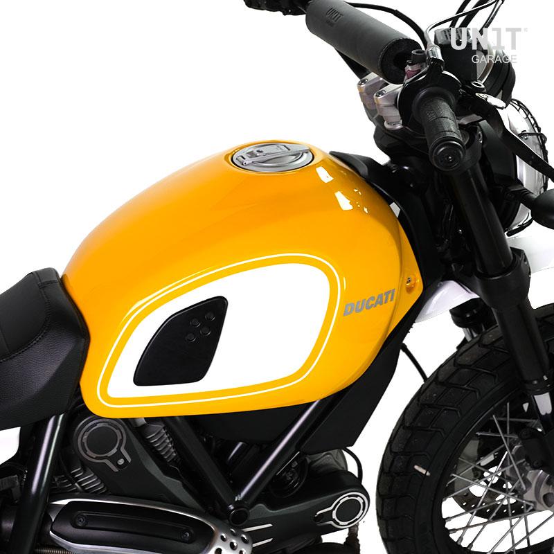 El look es genial. La bicicleta se vuelve más "apagada" y menos "encendida". Es más fácil de conducir porque tiene un tanque más corto que permite una mejor posición de conducción. Puede conducir hasta seis centímetros [2,3 pulgadas] más adelante. Ya no tendrás la extraña sensación de distancia del manillar, la sensación de conducción cambia para mejor. Las partes del kit se suministran pintadas, completas con gráficos bajo transparente y listas para montar o neutras si quieres pintarlas como desees. En unas horas tu scrambler se convertirá en un espléndido especial, sin tener que manipular ninguna pieza original, el kit es completamente reversible.