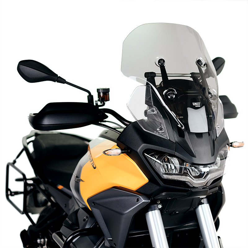 Medidas: El parabrisas Touring tiene la misma altura que el original, pero es 2 cm más ancho a la derecha y 2 cm más ancho a la izquierda. Grosor de 3 mm. Parabrisas con deflectores integrados.