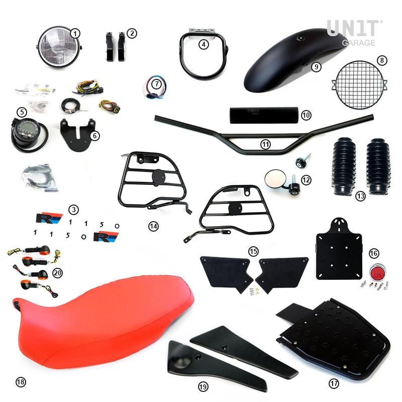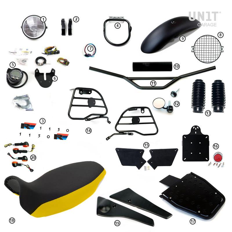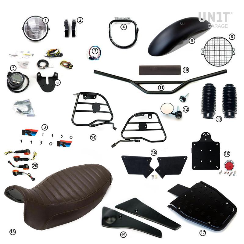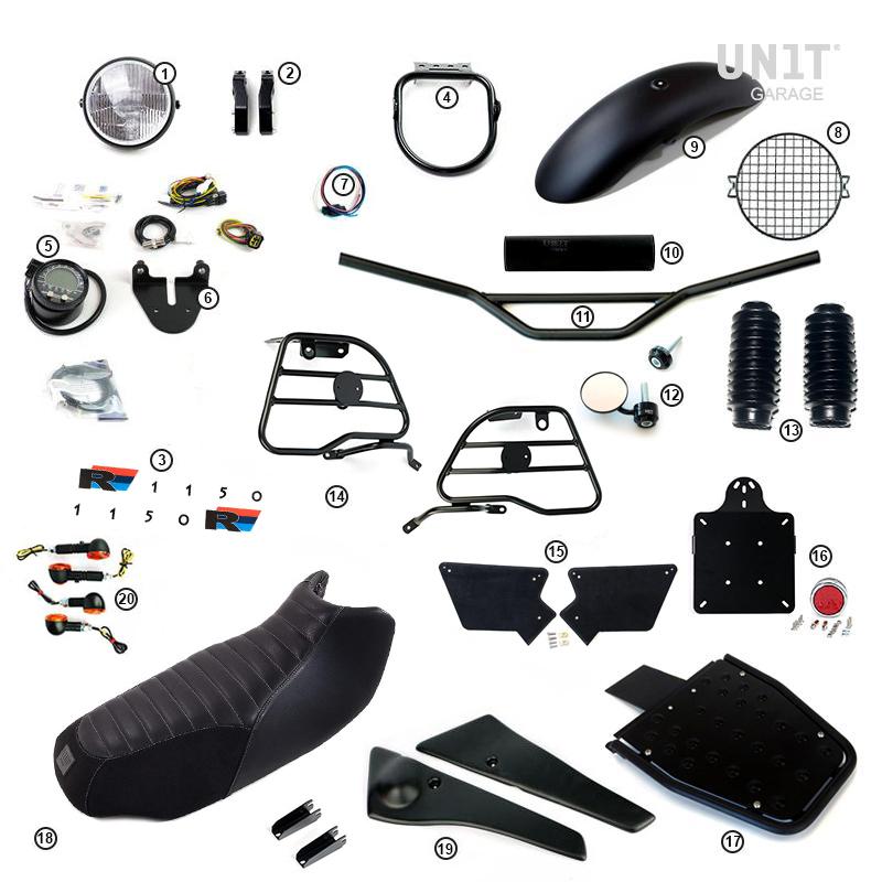 El Kit R1150R ahora también está disponible en la versión BÁSICA. El frente es mucho más minimalista y el radiador está ubicado frente al motor. La bicicleta se vuelve muy básica y liviana, hermosa sin parabrisas o alternativamente con parabrisas código: 1236 o código: 1575.