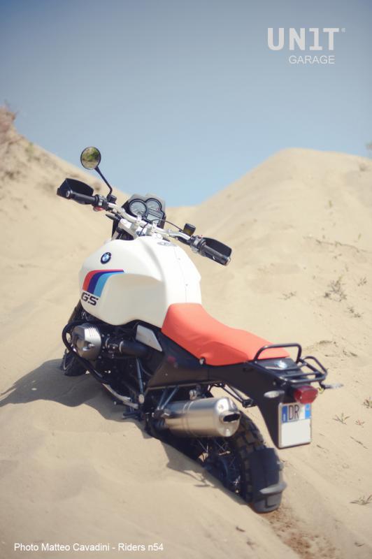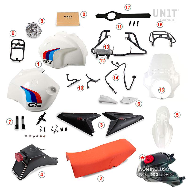 El KIT R120 G / S marca un regreso a los orígenes del G / S al tiempo que mantiene la comodidad y la facilidad de conducción de su bicicleta. Las piezas del kit de recambio pesan 6,4 kg menos que las originales y cuatro proceden de componentes que en el GS estándar se encuentran delante del manillar. Es por ello que la GS kittata es más manejable que el modelo de producción, tanto en ciudad como en el mixto. Tras unas 4 horas de montar el KIT R120 G / S habrás revolucionado el look de tu moto haciéndola única, sin cambiar nada de las piezas originales. El kit es compatible con todos los modelos R1200 GS de 2004 a 2012. En cualquier momento podrás restaurar tu bicicleta a su configuración original. Naturalmente, además del KIT básico R120 G / S, tendrás la posibilidad de implementar el R120 G / S con otros accesorios visibles en PARTES ESPECIALES. La motocicleta en configuración R120 G / S se puede equipar con maletas de aluminio originales ADV con marco de metal, o comprando nuestros marcos de maletas código 1220 puedes montar las clásicas maletas de plástico originales Vario (ver configurador). Equipado con neumáticos Tkc o Karoo, no encontrará obstáculos ni siquiera fuera de la carretera, también porque las preciosas piezas originales están seguras en su garaje. Personalícelo con el configurador y juzgue usted mismo. La R120 G / S se convierte en una fantástica réplica de la GS de los 80 o en una elegante scrambler según tus gustos.