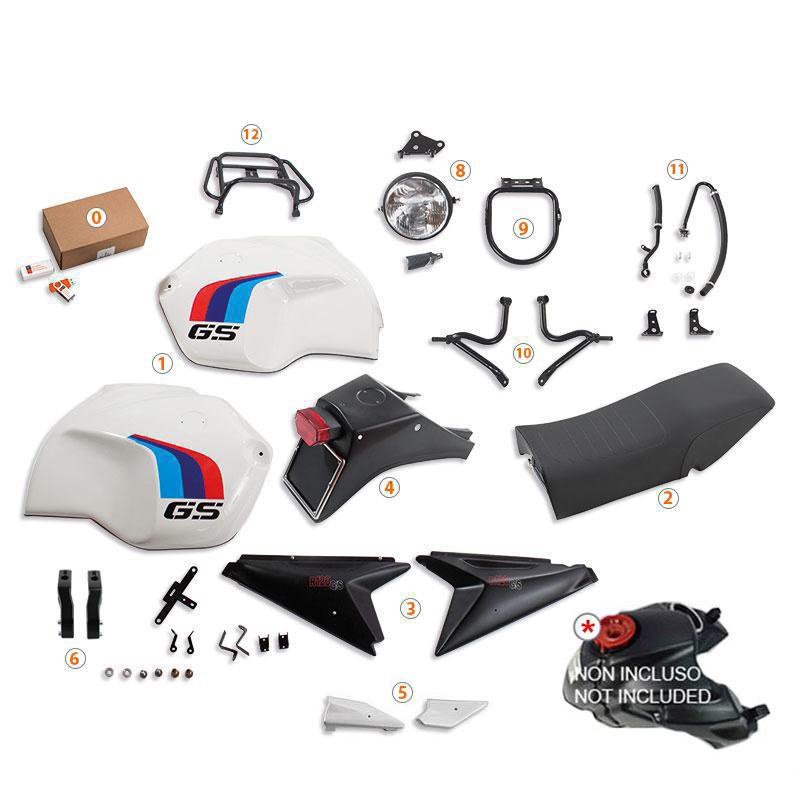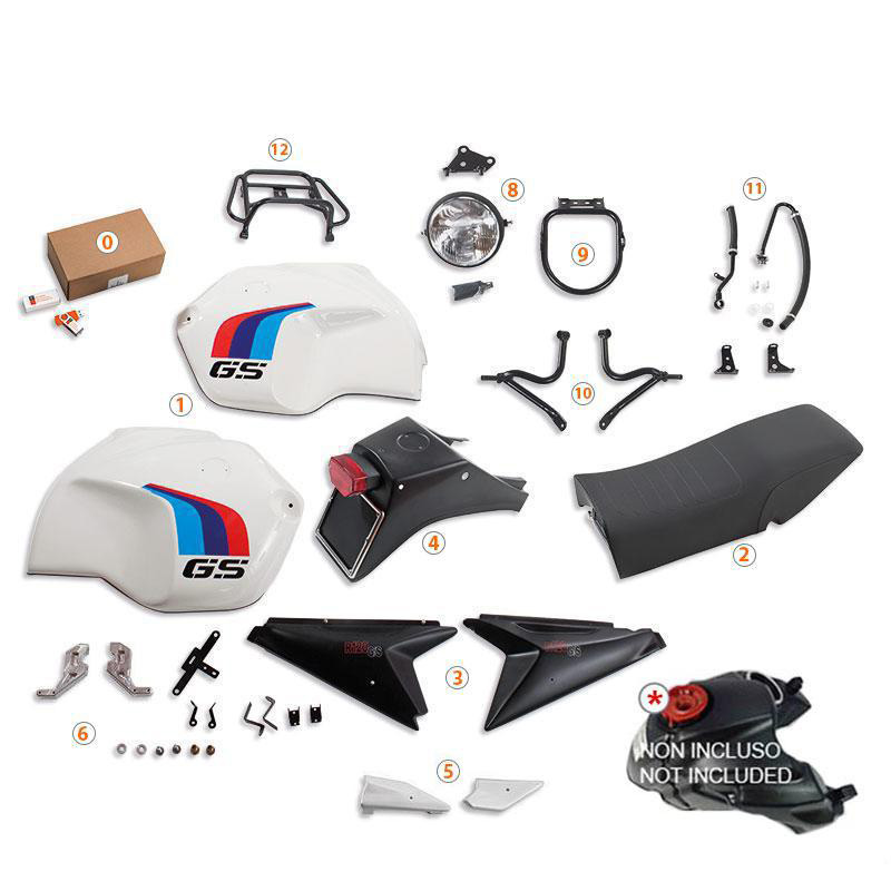El kit R120 GS ahora también se ofrece en la versión BASIC. La parte delantera es mucho más mínima y el radiador se coloca delante del motor. La bicicleta se vuelve muy básica y liviana, hermosa sin el carenado o alternativamente con el código 1236 o el código 1575 de carenados. NB: no compatible con guardabarros alto o parabrisas Fenouil.