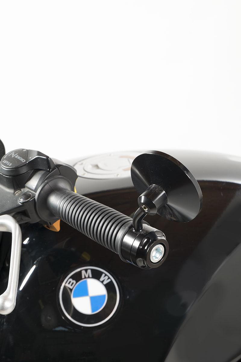 Espejo en aluminio anodizado negro construido ad-hoc. Fabricados con control numérico CNC, los terminales en este caso se suministran por pares. Los retrovisores siempre son un problema para el aspecto de la moto, que en este caso lo hemos solucionado de forma muy mínima. Se suministran completos con tapas de aluminio y tornillos de fijación (no se pueden equipar con tapas de manillar de plástico)