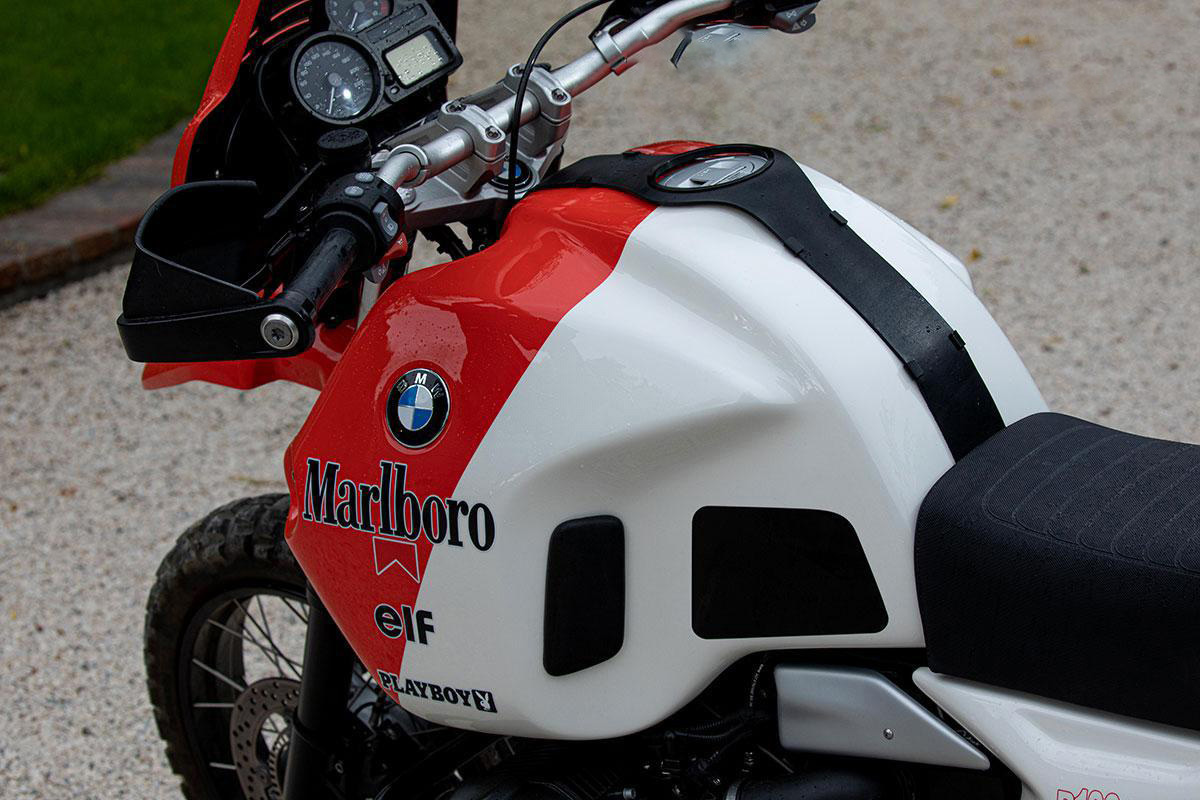Par de tapas de depósito en resina especial y MAT con refuerzos de fibra de carbono, acabado blanco ALPINEWHITE, gráficos RED y protecciones transparentes. Le dan a la moto un aspecto vintage fantástico que recuerda a la legendaria versión Paris Dakar.