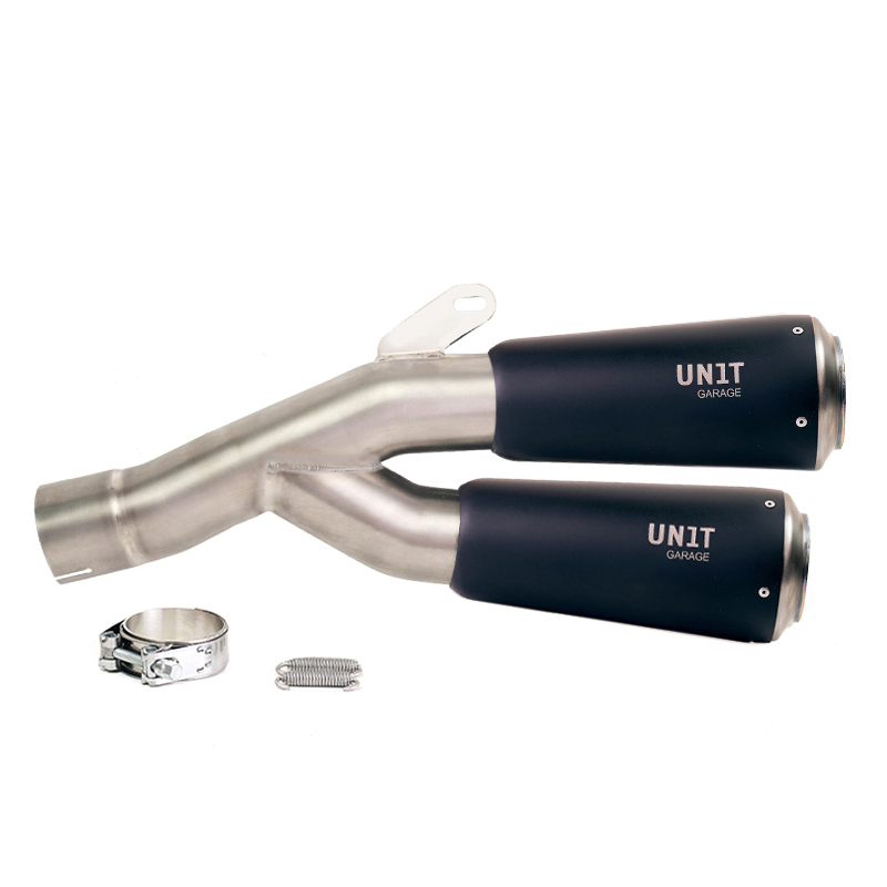 Silenciador de titanio y racores de acero inoxidable trabajados totalmente a mano, en perfecto estilo moto gp.