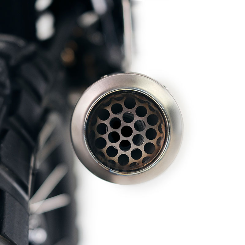 Para la R1300GS queríamos un escape refinado y elegante, pero también potente. Prestaciones y ligereza: sonido profundo en toda la curva de potencia y gran ahorro de peso. Silenciador homologado fabricado en titanio con racor de acero inoxidable. Se puede montar en los colectores originales dejando la válvula de escape y el catalizador de serie, o en nuestros colectores de competición. No requiere reasignación de la ECU ni otras modificaciones. Pesa aproximadamente 0,7 kg menos que el original. Se monta fácilmente en pocos minutos sobre el soporte original y es compatible con todas las maletas originales o aftermarket. El sonido te volverá loco y la entrega... ¡también!