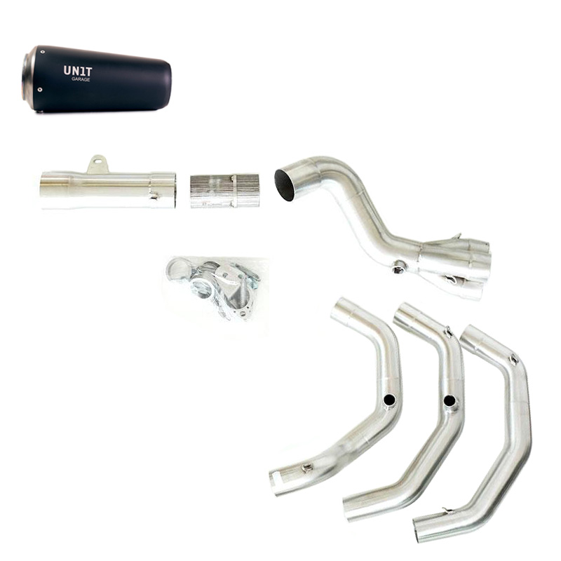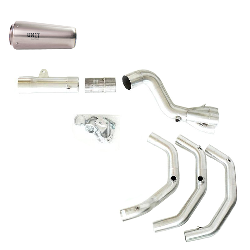 Sistema de escape HOMOLOGADO completo, colectores de diámetro variable, compensador y catalizador integrados en los colectores. Hecho de acero inoxidable con silenciador de titanio y DB-killer extraíble. Luzca fantástico, mejore la entrega de la Yamaha de 3 cilindros en toda la curva de potencia. No necesita ninguna intervención en la unidad de control, ¡el sonido es maravilloso!