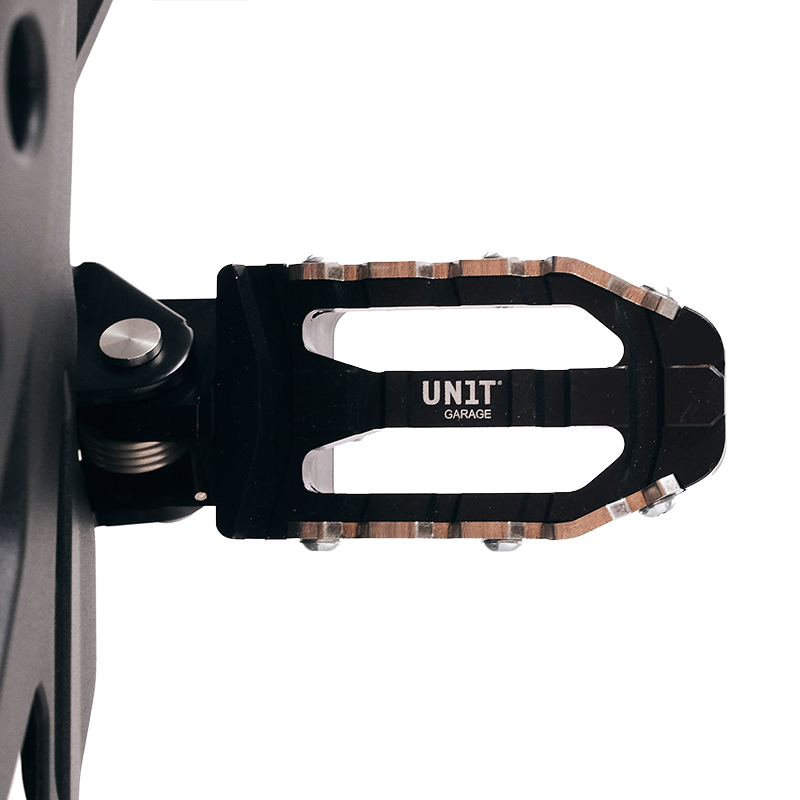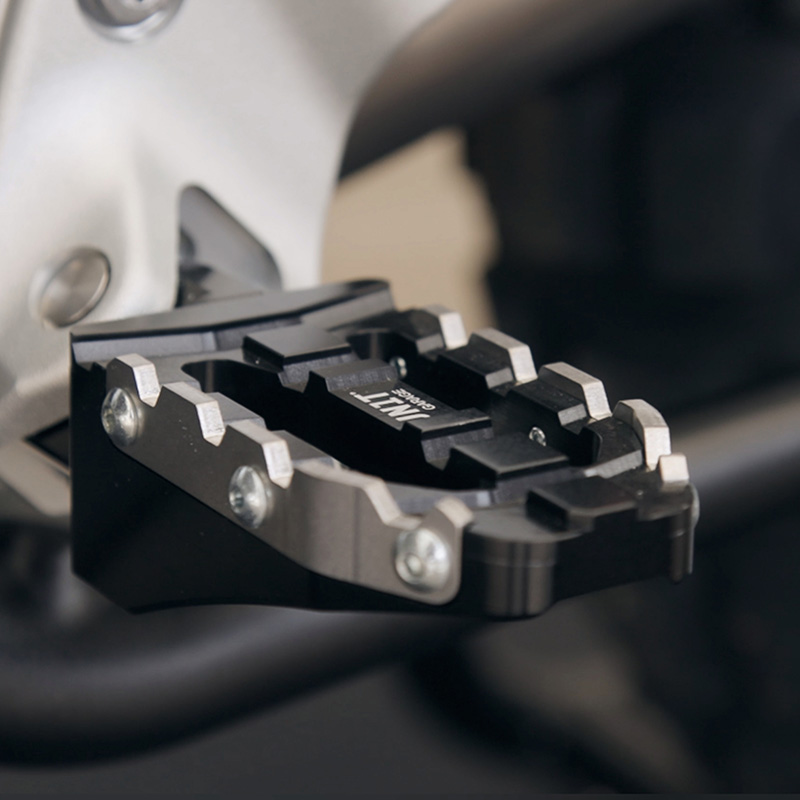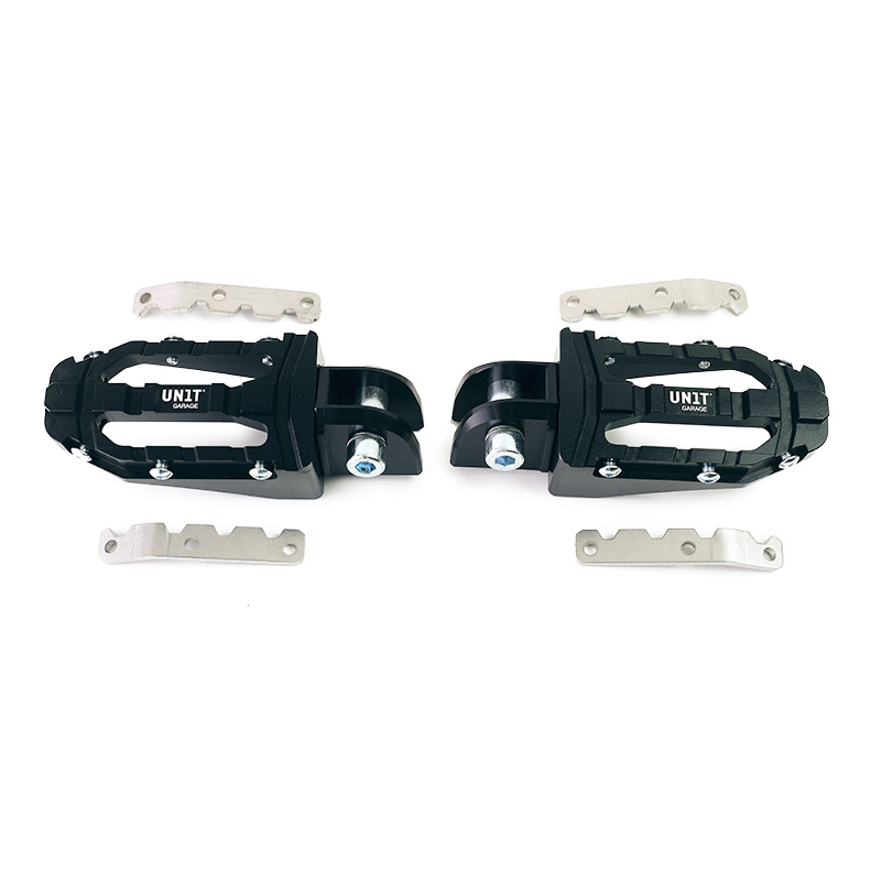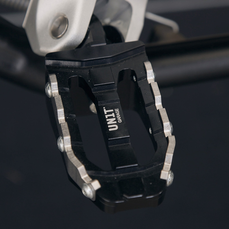 Par de reposapiés mecanizados en CNC macizo con inserciones de acero inoxidable. Mejoran significativamente el soporte de la bota todoterreno, especialmente cuando se conduce de pie, además estos reposapiés se pueden ajustar porque pueden girar 30 grados permitiendo a cada piloto una excelente ergonomía.