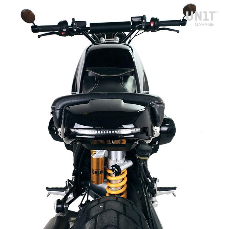 Cuando BMW diseñó el nineT Roadster, diseñó la parte trasera para que fuera completamente desmontable, no sólo el bastidor del pasajero sino también el asiento del pasajero. ¡Ahora puedes transformar tu nineT Roarster en un verdadero Roadster! Refleja las líneas de la moto, fantástica tanto con nuestros depósitos como con el original. Compuesto por dos semicarcasas de ABS con estructura interna de acero pintado con polvos epoxi. Se suministra con un inserto de aluminio CNC anodizado en negro que sustituye los intermitentes y el faro original. Se suministra ya cableado y listo para montar con clavijas compatibles con el sistema eléctrico OEM. Se puede montar en modelos nineT Roadster de cualquier año de producción. (EURO 3-4-5) La tira LED integrada se ilumina en color rojo, que aumenta de intensidad cuando se activan los frenos (luz de freno) y cambia de color a naranja en los extremos cuando se activan los intermitentes (ver vídeo). Completo con todo lo necesario para el montaje e instrucciones. Se suministra pintado o neutro (¡píntalo con los colores de tu moto!). Perfecto si se monta en combinación con nuestros accesorios.