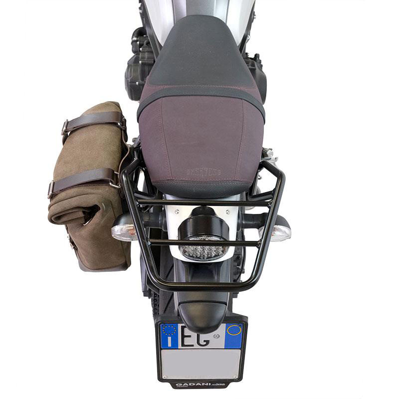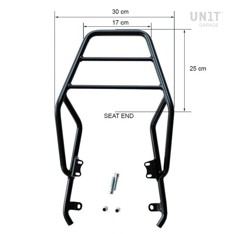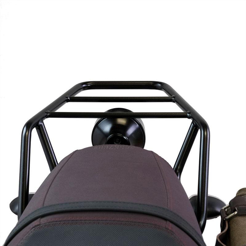 Portaequipajes fabricado en tubo de acero con acabado en polvo epoxi negro mate. Completa la parte trasera y está equipada con asas para el pasajero, se fija de forma muy sencilla al bastidor quitando el sillín. Robusto y práctico, mejora la estética de la moto.